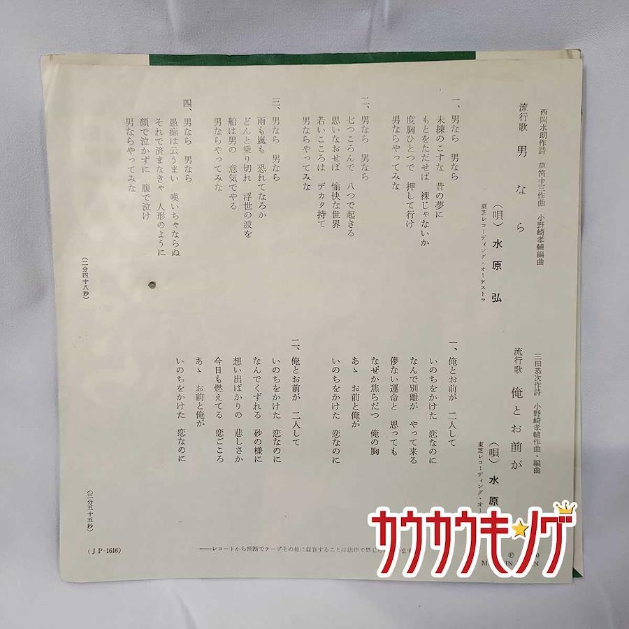[タイプ] EP 水原弘 「男なら/俺とお前が」 JP-1616 シングルレコード[状態] 古いものになるため、ジャケットなどに汚れ・ダメージがみられる場合があります。