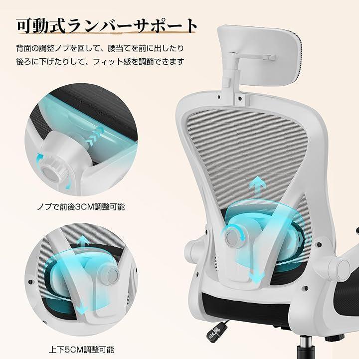 (1) 腰サポート上下&前後調節 —— 長時間作業でも腰がラク 上下5cm・前後3cmの多段調節ランバーサポートを搭載。