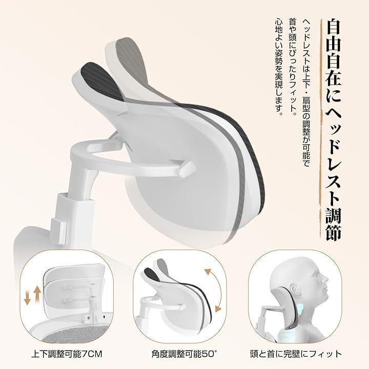 2Dヘッドレストは7cm昇降+50°角度調整に対応し、首・肩への負担を大幅に軽減します。