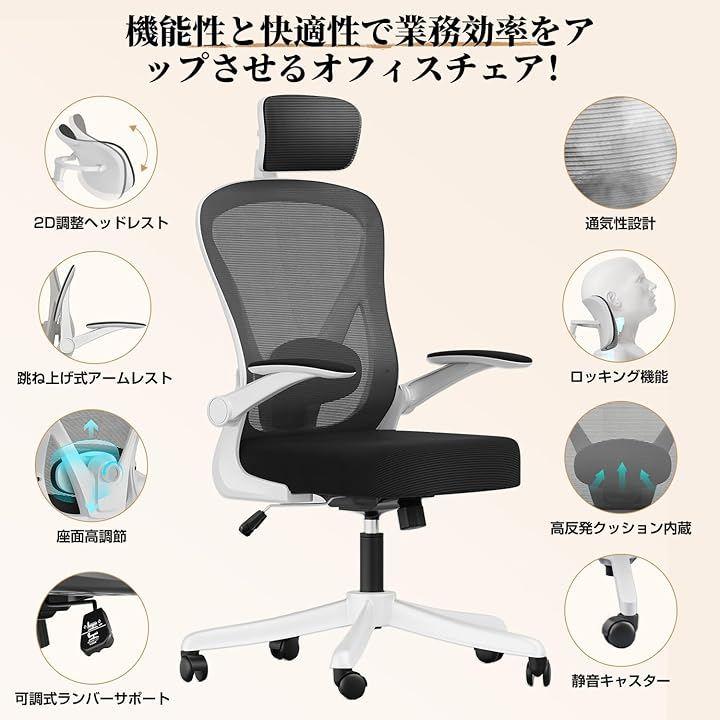 Ergonomic Mesh Office Desk Chair with Adjustable Headrest, Multi-Level Lumbar Support, 9cm Thick Cushion, 90° Swivel Armrests, 30° Rocking, and Quiet Casters