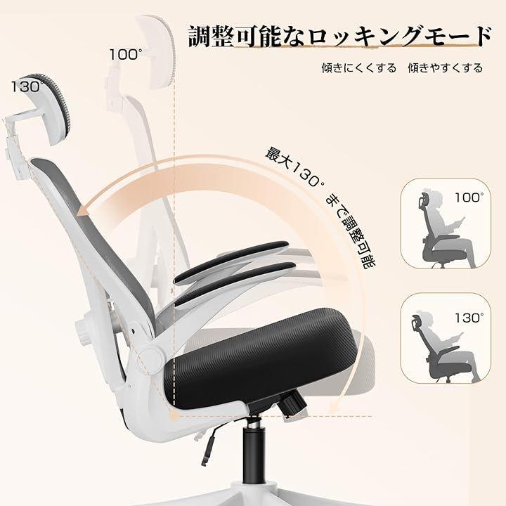 (4) 30°ロッキング機能 —— 仕事の合間にリラックス ロッキング幅は最大30°(初期角度100°>最大130°)。