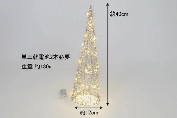 ワイヤーツリーの高さ:約40cmワイヤーツリーの横幅(直径):最大約12cmワイヤーツリーの重量:約180g材質:メタル・その他単三乾電池2本必要(市販の電池をお買い求めください)常点灯