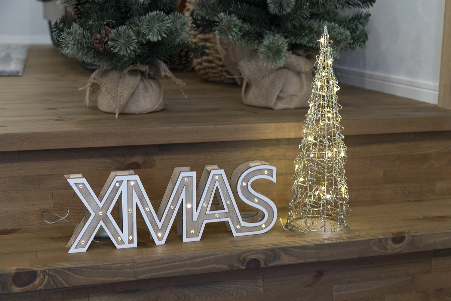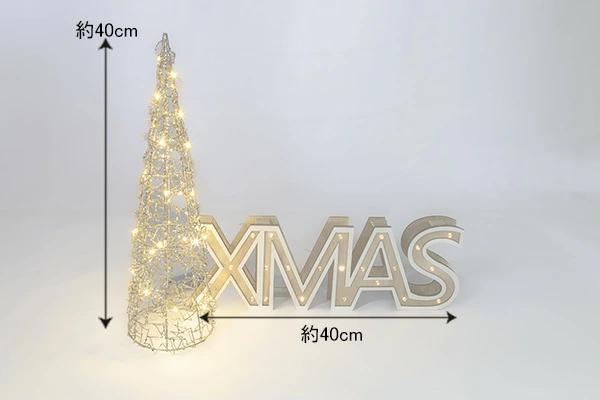 Xマスサインと40cmワイヤーツリーのセット☆存在感あるXマスサインXMASのサインは単体で40cm、コーンの高さも40cm。なので自然とそこに目が行く感じです。サインもコーンも光りますので夜の演出もばっちりです。