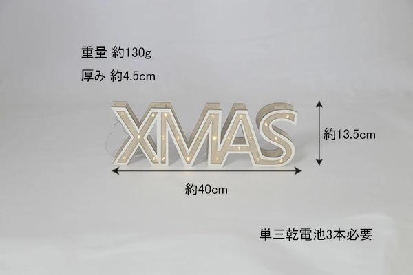 Xマスサインの高さ:約13.5cmXマスサインの横幅:約40cmXマスサインの厚み:約4.5cmXマスサインの重量:約130g材質:ウッド・その他単三乾電池3本必要(市販の電池をお買い求めください)常点灯室内仕様(雨や水がかからないようにお願いします。)
