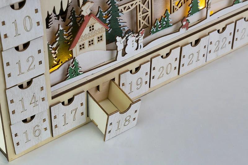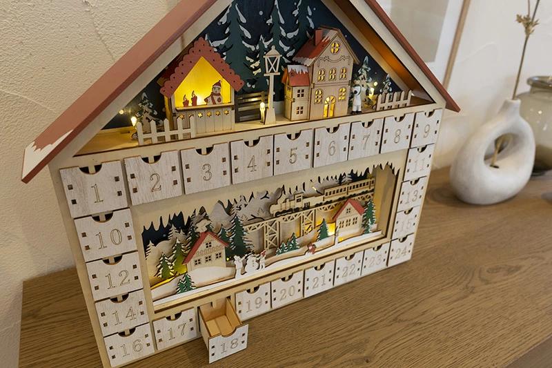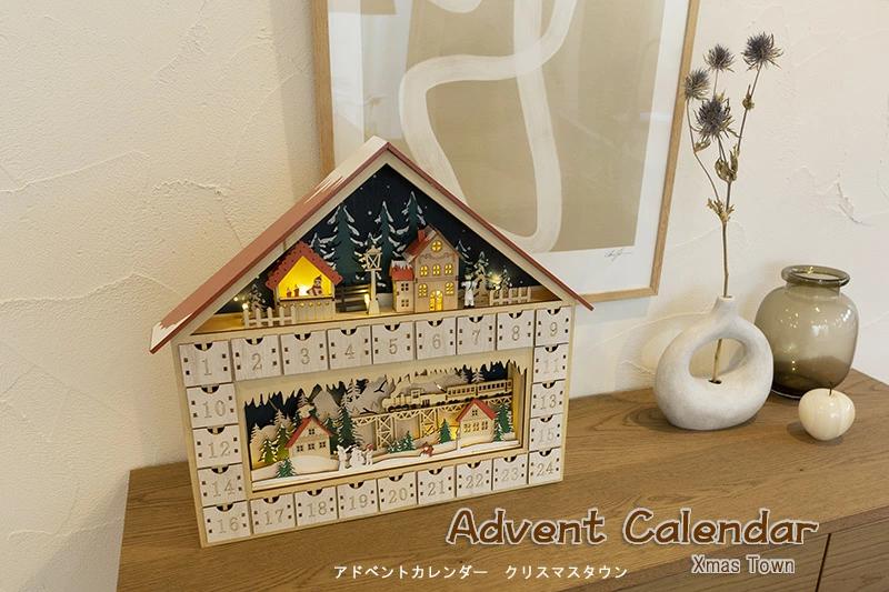 アドベントカレンダーはクリスマスまで一つずつ中を開けていくカレンダーです。このカレンダーは24個の引き出しがありますので、12月1日から開けていくタイプです。中に小さなお菓子を入れて楽しんでください。引き出しを順番にならべてもいいし、ランダムにして探してもらうのも面白いですね。また、木製のとても可愛いカレンダーですのでインテリアとしてクリスマスシーズンずっと飾っていただいてもOKです。