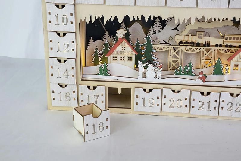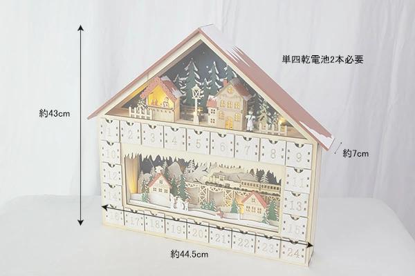 一般名称アドベントカレンダー原材料名 ウッド・その他ボックスサイズ高さ:最大約30cm横幅:約32cm厚み:約6cm単四電池2本使用(別売)