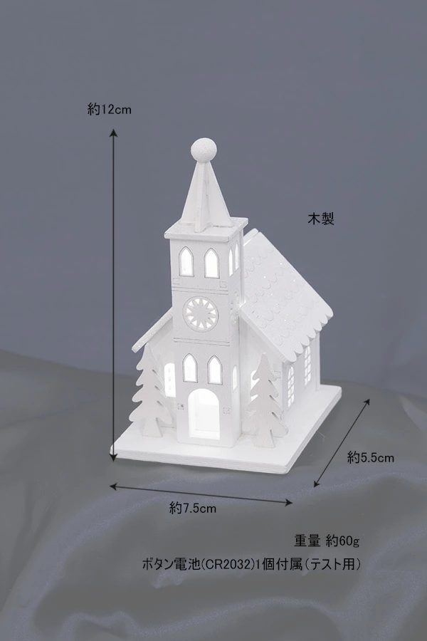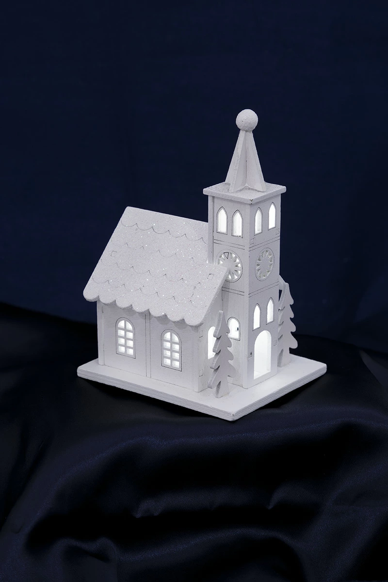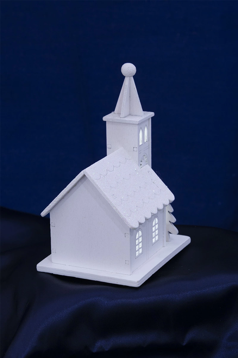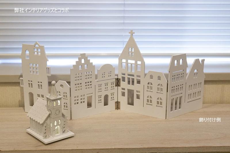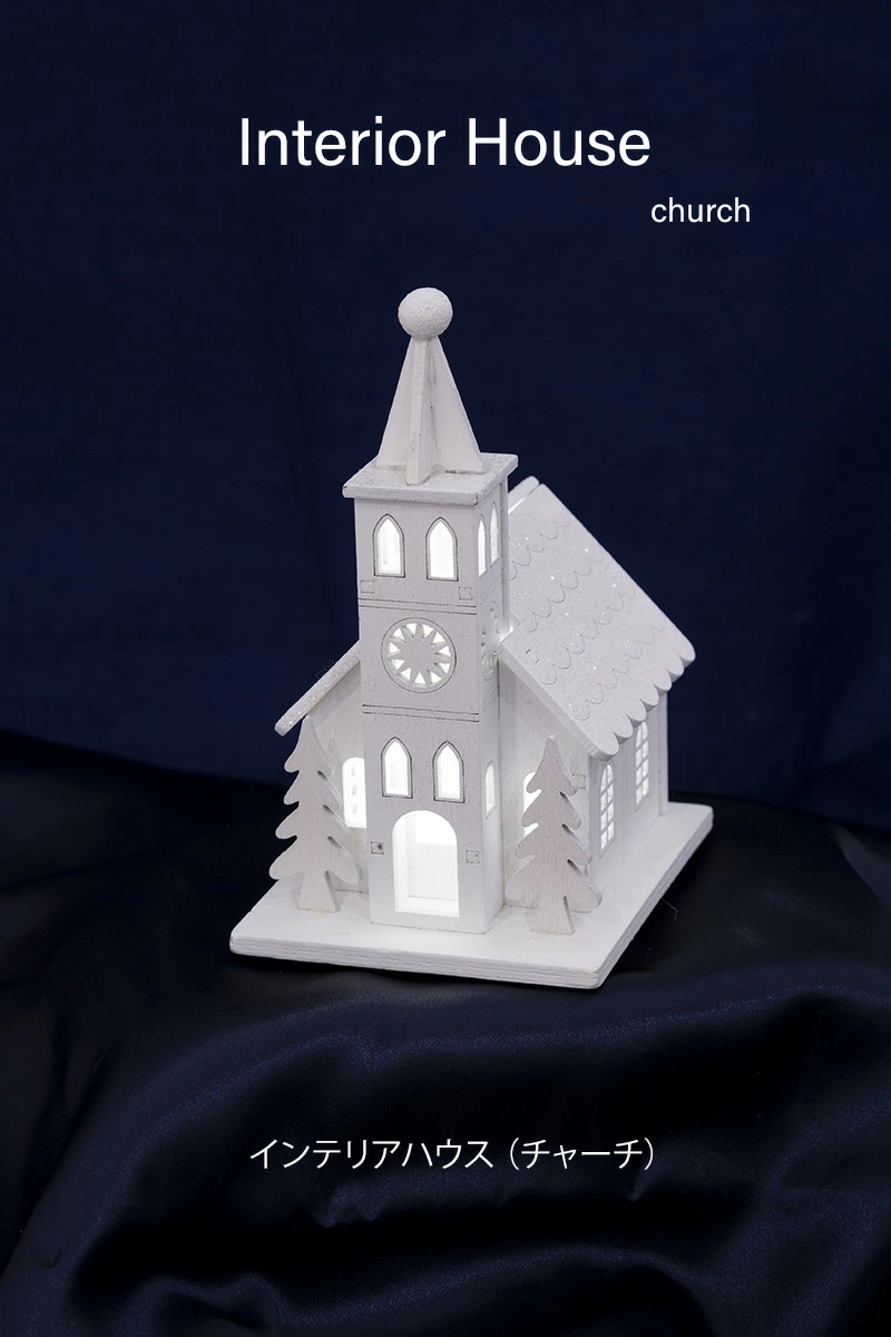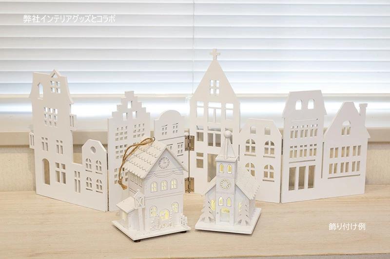 インテリアハウス(チャーチ)☆木てこしらえた白いお家色を多く使わず白をメインにしたインテリアです。白を基調としていますので、いろんなアイテムと合わせやすく、なじみやすいのが特長です。木製の本品は、特にデコタウンボード(ホワイト)との合わせ方が秀逸です。ホワイトLED球が優しく輝きますのでお部屋の照明を落としていただくと、とてもいい雰囲気になります。