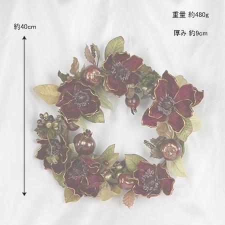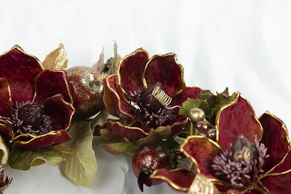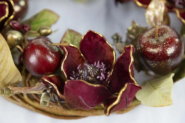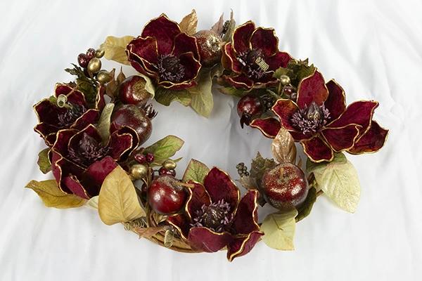 木蓮の仲間のマグノリア(あるいは別名)はとても美しい花で、それをデコラティブにしてさらに美しくアレンジしました。花言葉は威厳、崇高などの他に前途洋々とかあるそうです。リースは縁起物の意味合いもあるので前向きな花言葉がある花はいいですね。