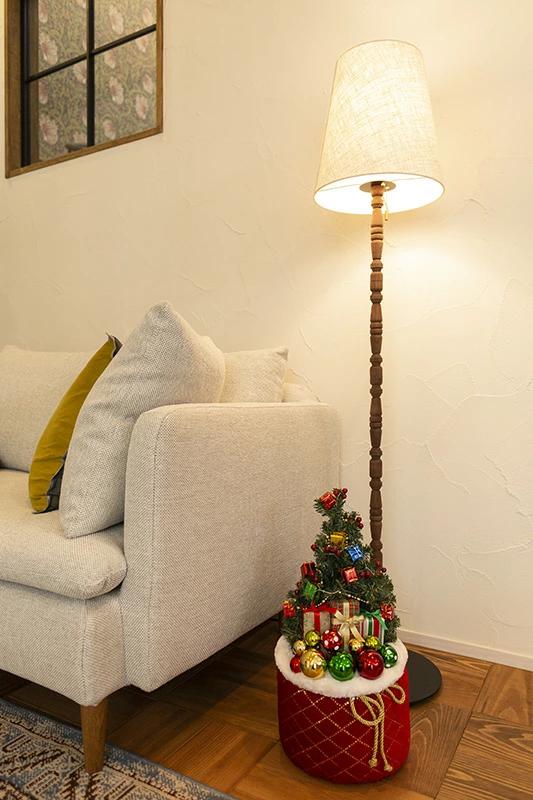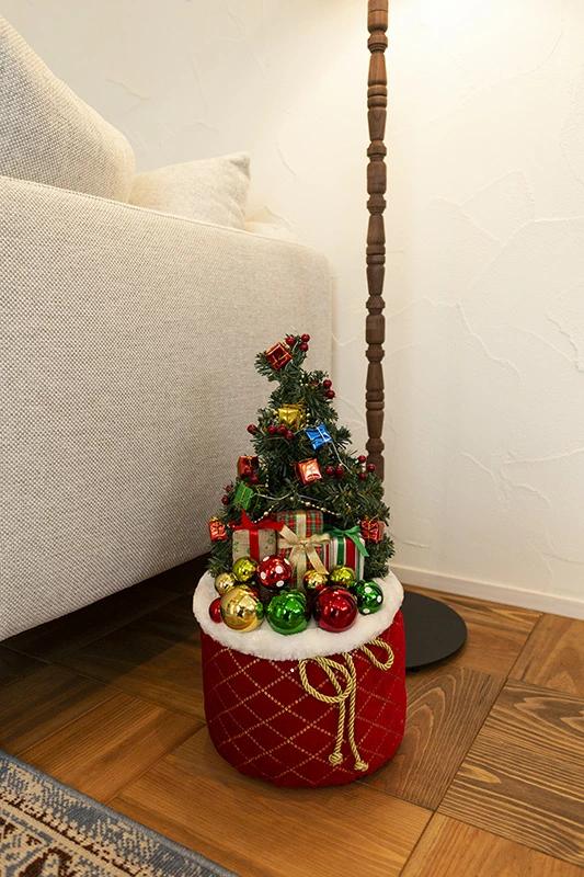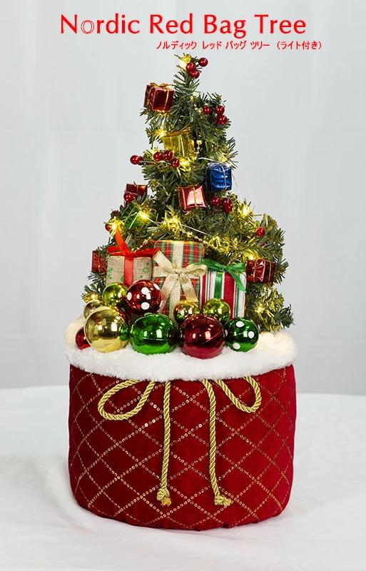 柔らかなプレゼントバッグを土台にしたデコレーションクリスマスツリーです。プレゼント箱や木の実が飾られており、ツリーの裾には大小のボール。そしてライトまで付いています。飾り付ける手間がなく枝を整えるだけでどこにでも飾ることができます。つまり、置くだけでクリスマスなのです。
