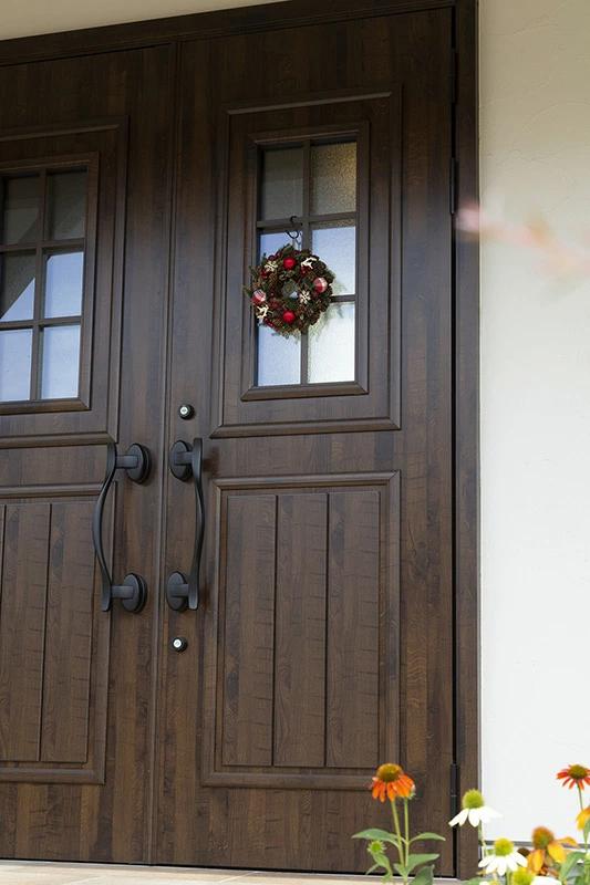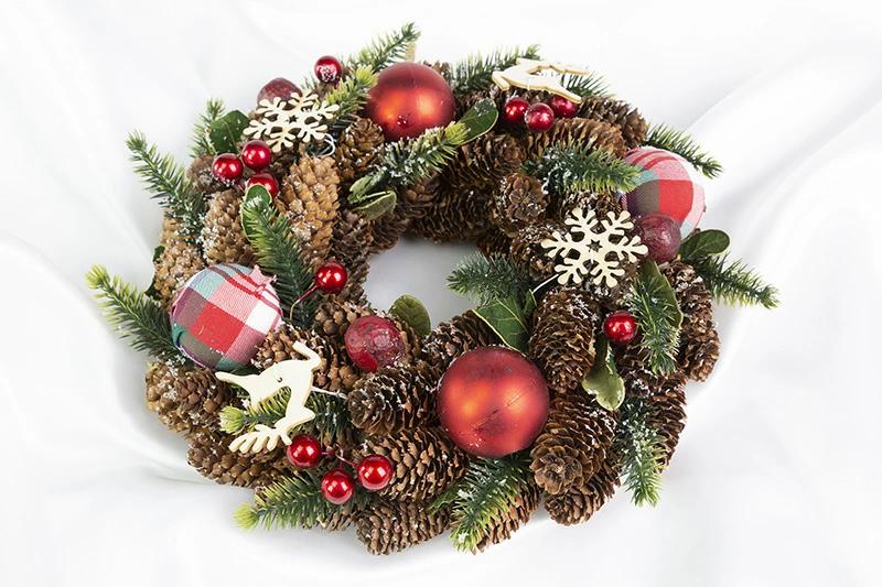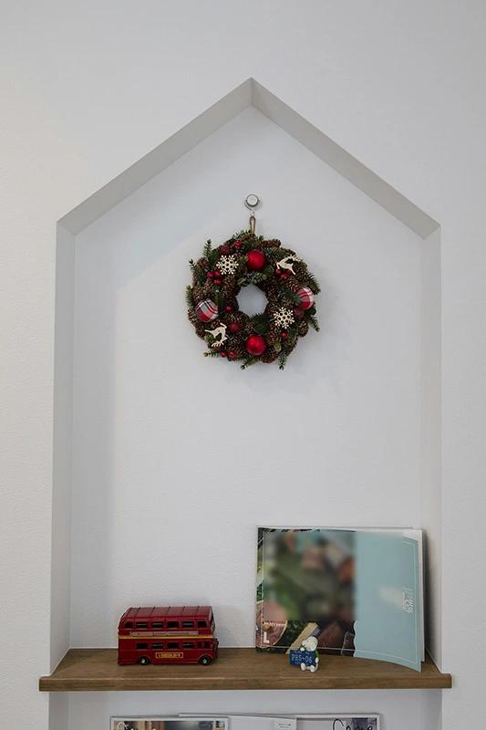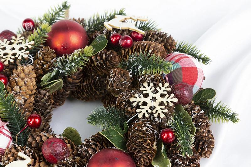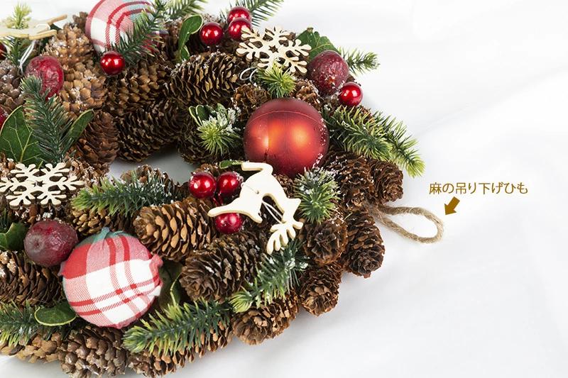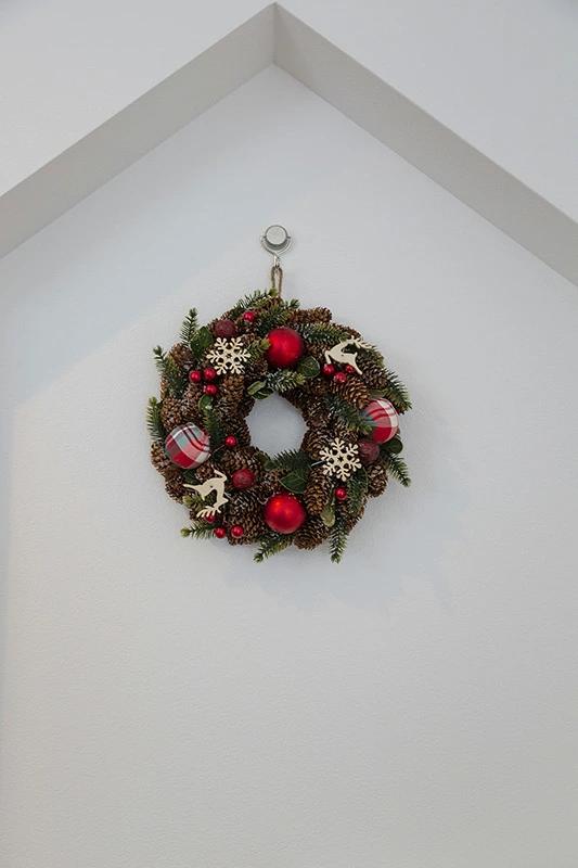 チェック柄の布を施したボール。トナカイやスノーフレークの形にした木のプレート。そして赤い木の実。そのどれもがかわいらしさを演出したリースです。