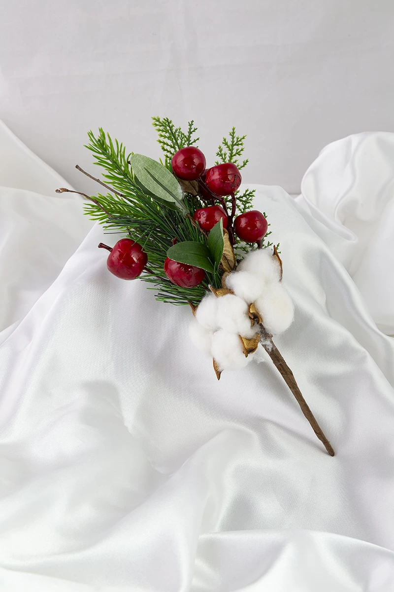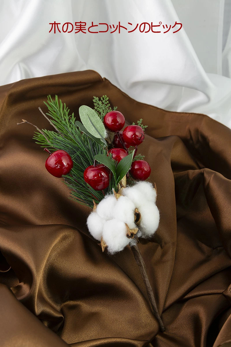木の実とコットンのピック☆フワッと可愛いピックコットンの実が付いた可愛いピックはいかがですか?木の実だけだと清楚な感じになるピックもフワッとしたコットンの実が付いているとなんだか優しく軽やかな雰囲気になりますね。かわいい系から大人系のオーナメントたちとしっくりマッチするアイテムですよ。