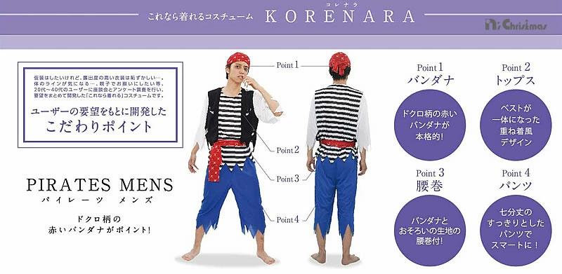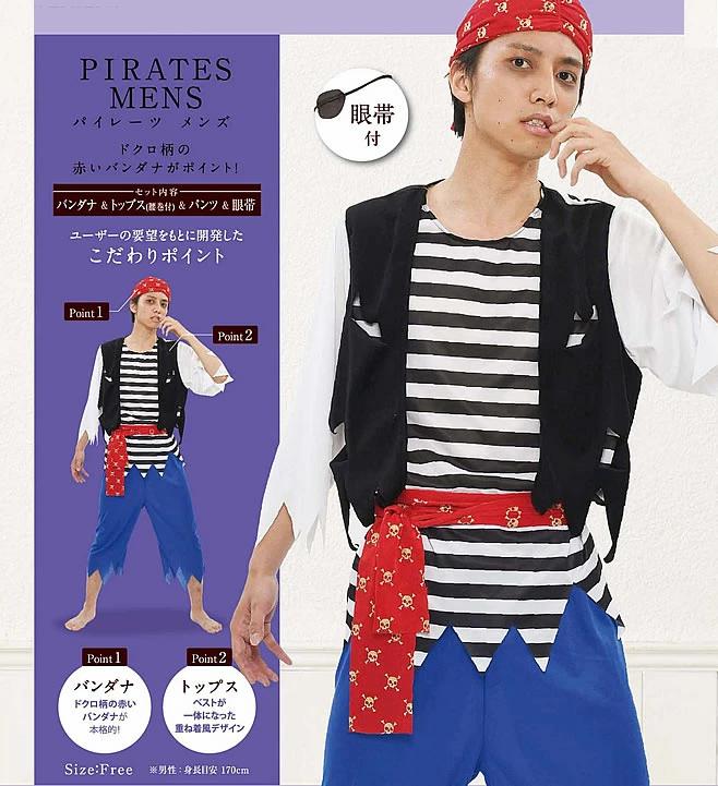 仮装はしたいけれど、露出度の高い衣装は恥ずかしい・・・。体のラインが気になる・・・。親子でお揃いにしたい等、20代~40代のユーザーに座談会とアンケート調査を行い、要望をまとめて開発された「これなら着れる」コスチュームです。幼稚園、保育園、学校、遊園地などのイベントに最適です。★ユーザーの要望をもとに開発されたこだわりポイント★ポイント1:ドクロ柄の赤いバンダナが本格的!ポイント2:ベストが一体になった重ね着風デザイン。ポイント3:バンダナとおそろいの生地の腰巻付!ポイント4:七分丈のすっきりとしたパンツでスマートに!