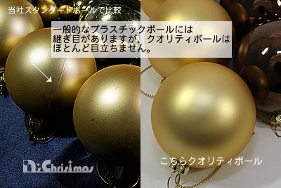 一般的なプラスチックボールは半球を合体させてボール型にするのでその継ぎ目が目立ってしまい、それがチープな感じでがっかりです。クオリティボールはそれをできるだけ目立たないように工夫しています。そんなにがんばってるのにお値段もクオリティなオーナメントです。※表面に若干のこすれがございますのでご容赦ください。