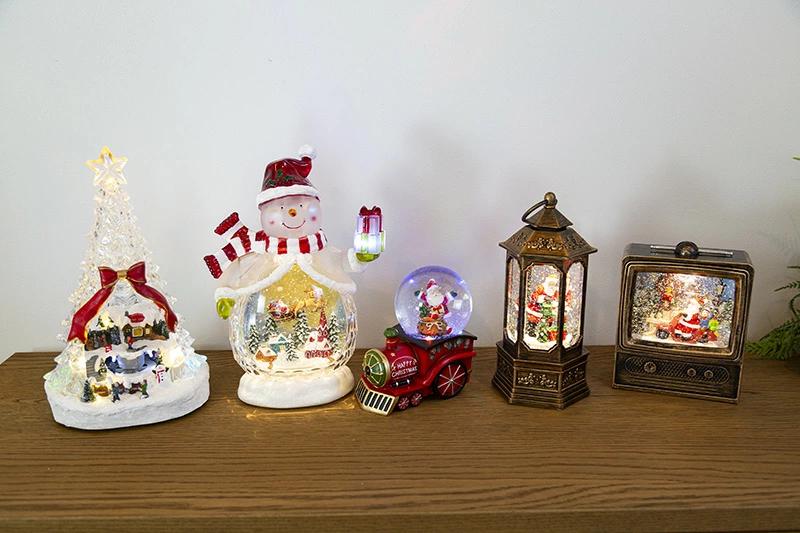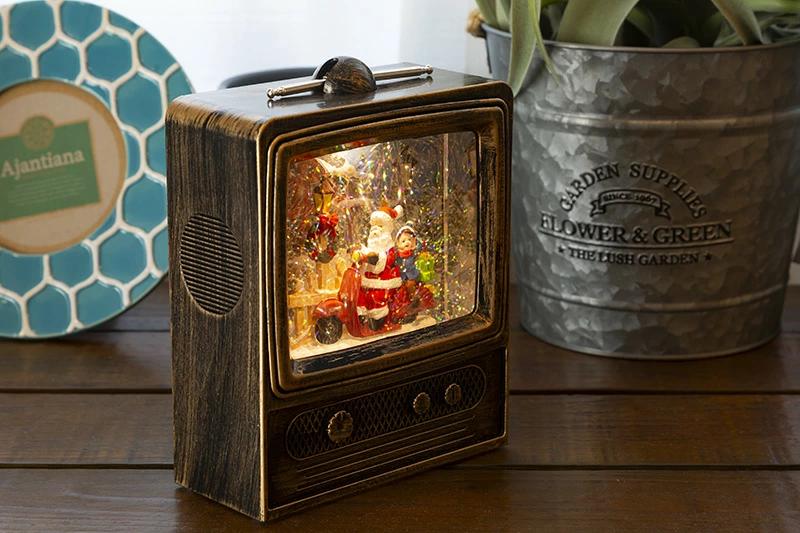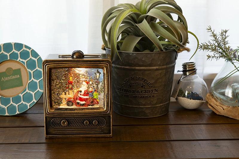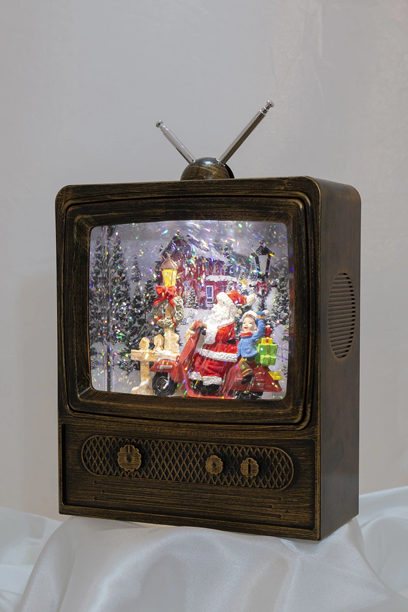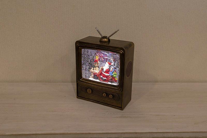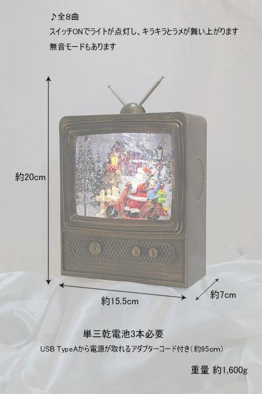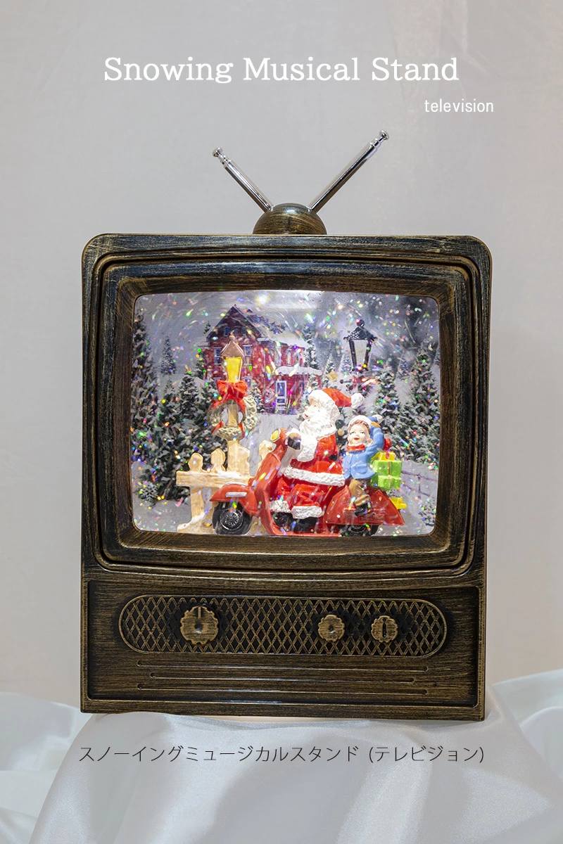 スノーイングミュージカルスタンド(テレビジョン)☆テレビの中は雪景色テレビ型のスノードームです。イブのサンタさんは大忙し。スクーターにまたがりプレゼントを配達中。お手伝いの少年も楽しそうです。スイッチオンでキラキラのラメが舞い、クリスマスミュージックを奏でます。音楽もオン、オフできて全8曲でループします。また、USB電源ジャックも付属しており、電池切れの心配はありません。(もちろん乾電池でもご使用になれます)