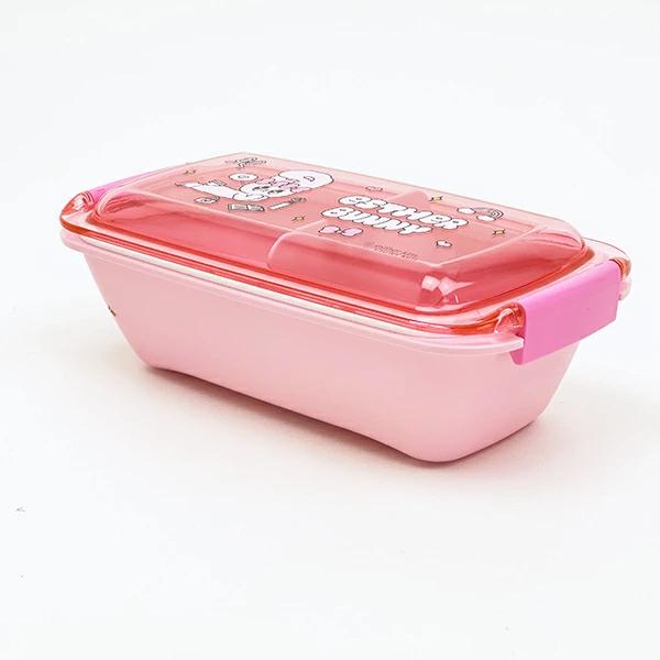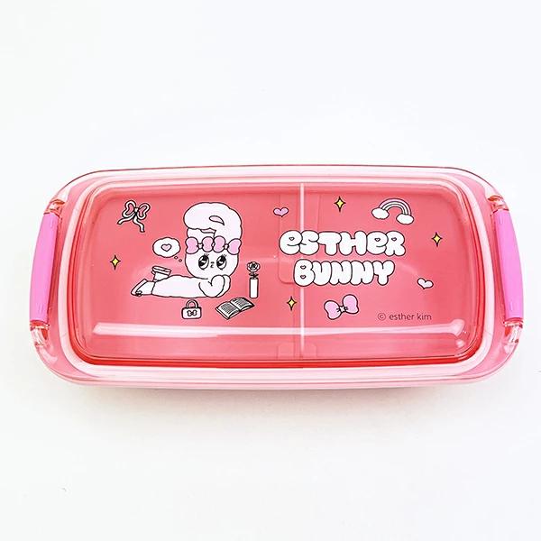 フタのクリアピンクがとってもカワイイ!全部ピンクなエスターバニーランチボックスです。パッキン溝の幅が広い構造で洗いやすいお弁当箱。ドーム型のフタで、ふわっとご飯やおかずが詰められる。高めの仕切り付きでおかずが片寄りにくい!しっかり簡単2点ロック!フタを外して電子レンジOK!食洗機OK!!容量:530ml