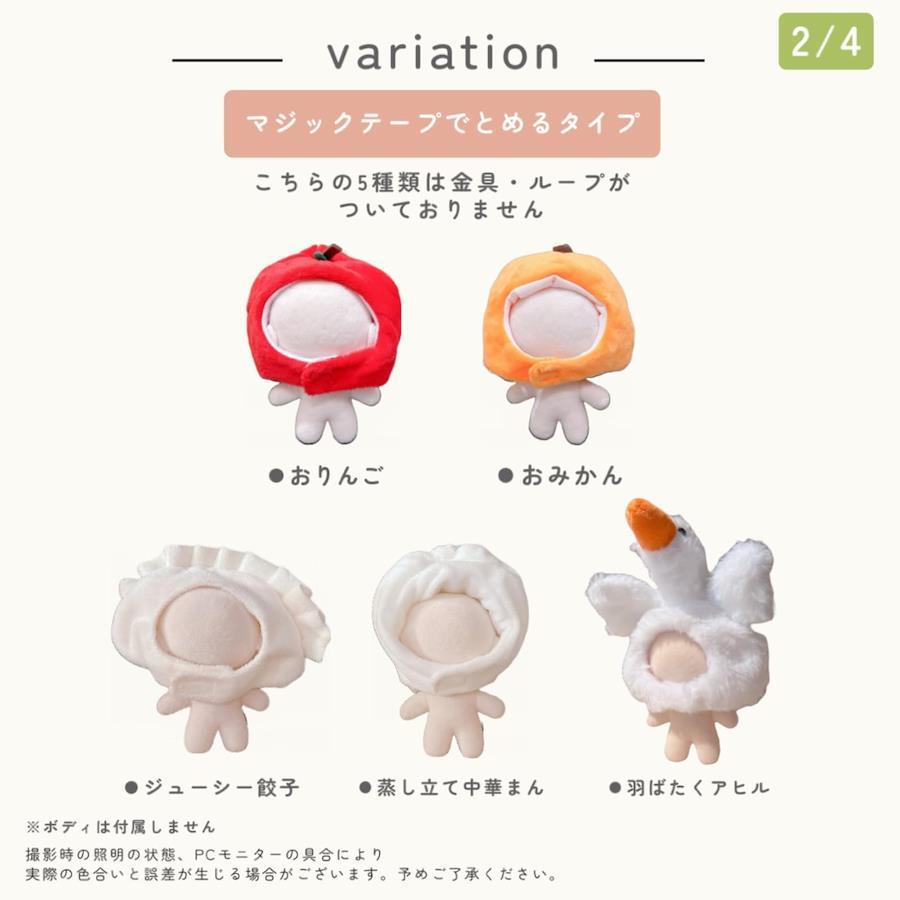 推しぬいをもっと可愛く!推しが美味しそうな食べ物に大変身…!?おもしろかわいいぬいぐるみのかぶりものです。??お顔を入れて着せてあげてください。??約10~12cmのボディ向けのサイズです(デザインにより頭の深さが異なります / 商品画像参照)??ピッツァのみポーチタイプとなっております。??キーホルダー金具は取り外しが可能です。各メーカーのぬいボディ,ぬい服共に綿の詰まり具合や生地の質感・伸び方に個体差がございます。サイズ表記は参考値としてご覧ください。ぜひ推しのぬいを可愛くコーディネートして さらに楽しい推し活を♪《 製品詳細 》??お届けする商品:小さい 推しぬいのかぶりもの※撮影に使用しているボディやスタンドは付属しません??種類:オプションよりご希望のデザインをお選び下さい。??個数:1点??サイズ:約10~12cmの小さいぬい向け各メーカーのぬい,ぬい服共にそれぞれ綿の詰まり具合や生地の質感・伸び方に個体差がございます。サイズ表記は参考値としてご覧ください。※商品写真はイメージです。※各商品写真の色合いは、モニターの設定などにより実際の商品と異なる場合がございます。あらかじめご了承ください。【とろけるプリン】顔出し部分 横幅:約60mm首周り:約60mm横幅:約110mm顔出し部分 縦幅:約25mm縦幅:約105mm【アチアチたこ焼き】顔出し部分 横幅:約60mm首周り:約70mm横幅:約100mm顔出し部分 縦幅:約20mm縦幅:約90mm【ぐつぐつゆでダコ】顔出し部分 横幅:約50mm首周り:約70mm横幅:約100mm顔出し部分 縦幅:約35mm縦幅:約110mmサクッとえびフライ(ポンチョ)着丈:約40mm前を閉じた時の横幅:約110mmフードの高さ:約55mm前を開けた時の横幅:約175mm・餃子顔出し部分 横幅 : 約70mm顔出し部分 縦幅 : 約35mm首周り : 約100mm横幅 : 約160mm縦幅 : 約100mm・中華まん顔出し部分 横幅 : 約70mm顔出し部分 縦幅 : 約55mm首周り : 約85mm横幅 : 約110mm縦幅 : 約110mm【ミニ食パン】顔出し部分 縦幅:約50mm顔出し部分 横幅:約45mm全体 縦幅:約100mm全体 横幅:約100mm【ミニ骨付きチキン】顔出し部分 縦幅:約50mm顔出し部分 横幅:約55mm全体 縦幅:約140mm全体 横幅:約110mm【おみかん】顔出し部分 縦幅:約35mm顔出し部分 横幅:約55mm首周り 幅:約85mm全体 縦幅:約100mm全体 横幅:約1110mm【おりんご】顔出し部分 縦幅:約30mm顔出し部分 横幅:約70mm首周り 幅:約85mm全体 縦幅:約75mm全体 横幅:約115mm サイズ:約10~12cmの小さいぬい向け デザインにより頭の深さが異なります ピッツァのみポーチタイプ キーホルダー金具は取り外しが可能
