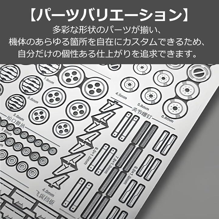 「パーツバリエーション」多彩な形状のパーツが揃い、機体のあらゆる箇所を自在にカスタムできるため、自分だけの個性ある仕上がりを追求できます。