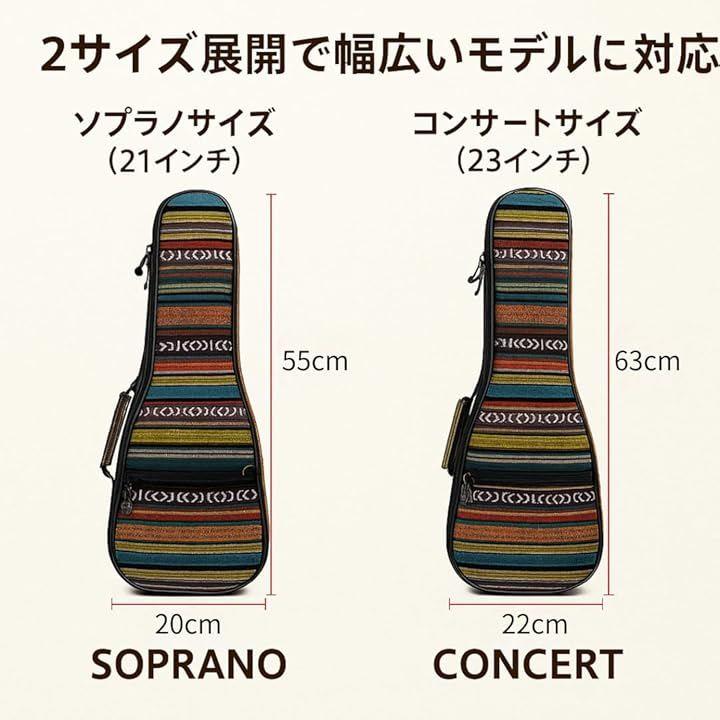 2サイズ展開で幅広いモデルに対応 ソプラノサイズ(21インチ)とコンサートサイズ(23インチ)の2種類を用意しており、使用するウクレレのサイズに合わせて選択可能です。