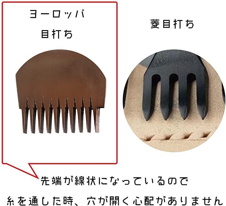 ・ヨーロッパ目打ちは先端の刃先が菱目打ちの点ではなく線の為、糸の角度が鋭角に傾き、斜めになります。