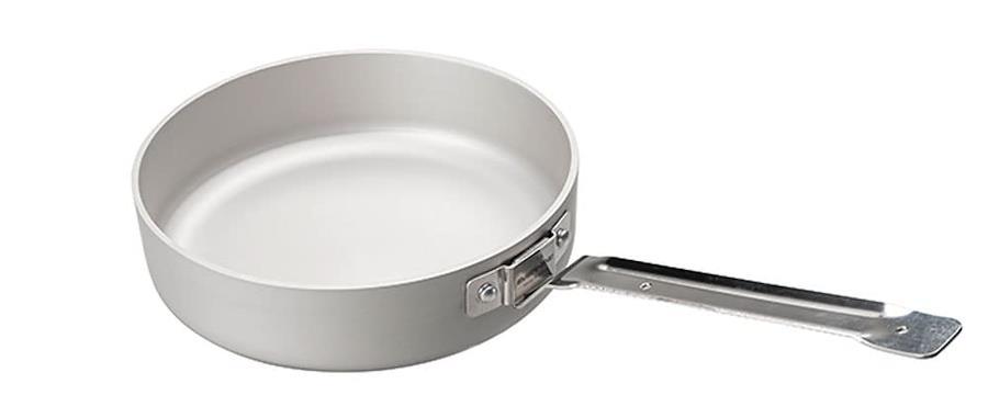 クッカーとフライパンの中間的なサイズ。2mm厚の日本製アルミ材を日本の職人が一つ一つヘラ絞りで作り上げる一生モノのフライパン。底面全体をムラなく加熱します。コーティングも無し、ハンドルも脱着式で焚火でも使えます。