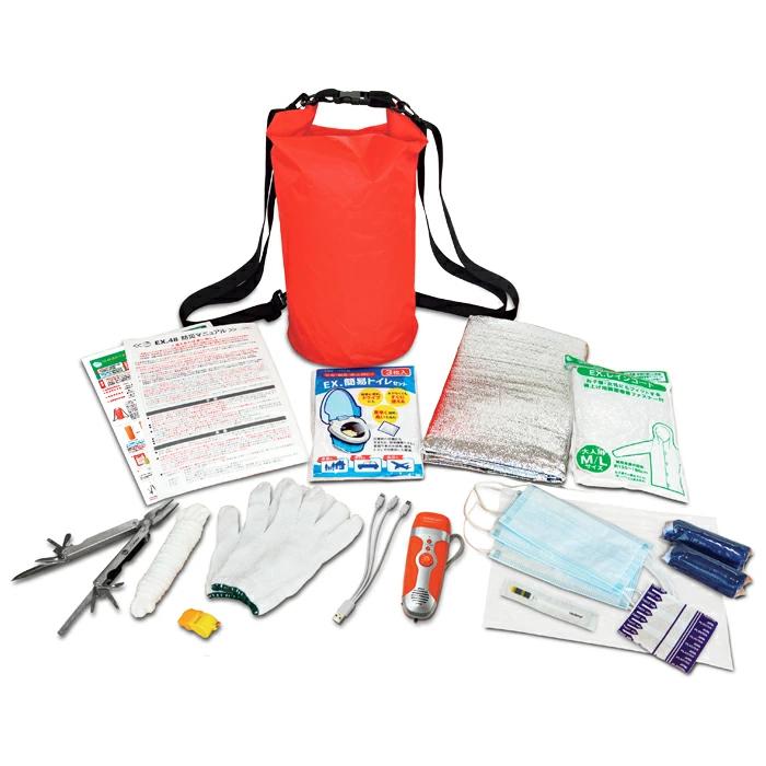 ドライバッグ ダブルショルダー(約直径21×55cm)、FMラジオ付多機能自家発電ライト(14.5×5.5×4cm)、簡易トイレセット(3枚)、コンパクトマルチツール、液晶体温計フラットミニ×各1、その他防災用内容物