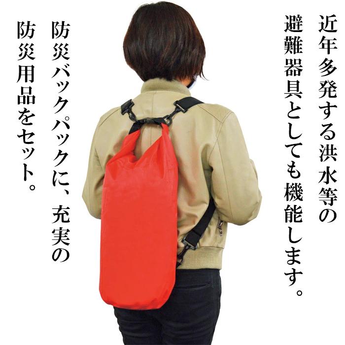 浮き具(ライフジャケットL1同等の浮力)になる防災バックパックに、充実の防災用品をセット。重量はわずか0.9kgで、緊急時にすぐに持ち出せます。近年多発する洪水等の避難器具としても機能します。