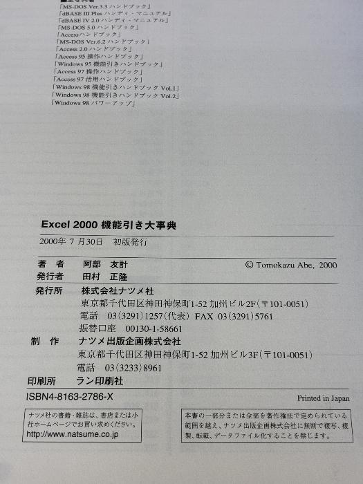 ■商品詳細■ 商品名・Excel2000機能引き大事典 ナツメ社 阿部 友計/ ■商品状態■表紙にスレ、ヤケ、シミ、折れ目、傷み、天地小口にスレ、ヤケ、シミ、本にスレ、ヤケ、シミ、折れ目、傷み、があります。本を読むことに支障はございません。※注意事項※■毎商品チェック後出品しておりますが、中古品ということもあり、多少の書き込み等のチェック漏れがあった際はご容赦下さい。■付録等の付属品がある商品の場合、記載されていない物は『付属なし』とご理解下さい。■併売販売をしているため、在庫切れの場合はキャンセルとなります。予めご了承ください。