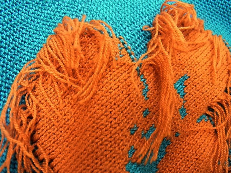 ●コットンとアクリルを使用したコードヤーンで編まれたニット。シングルジャガード編みにすることでフリンジのようなデザインを表現。