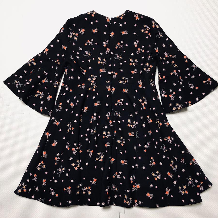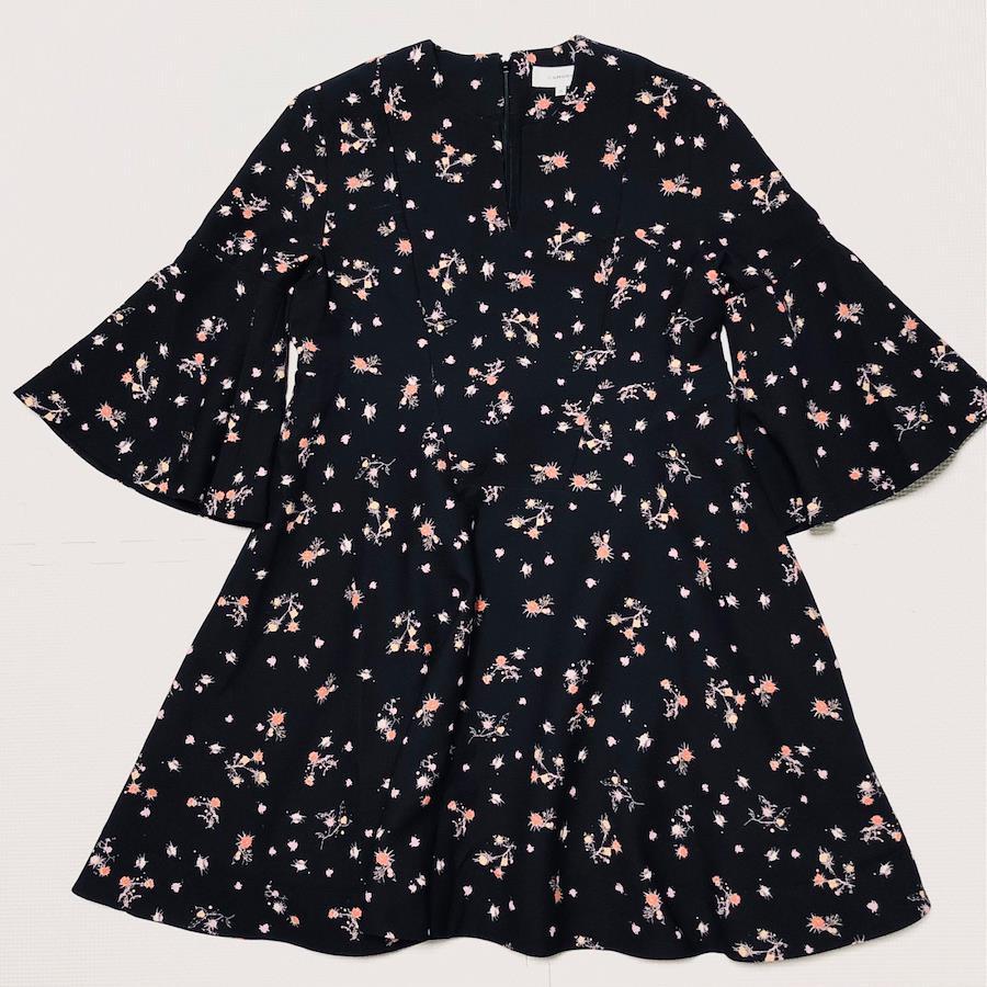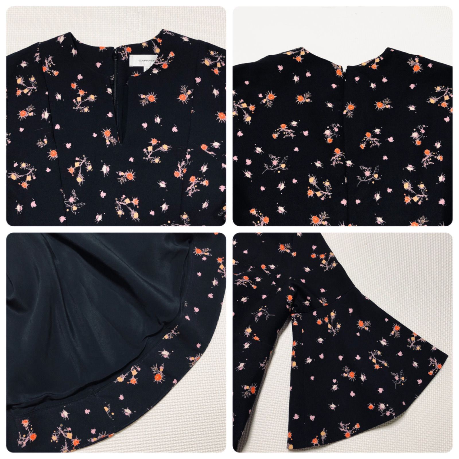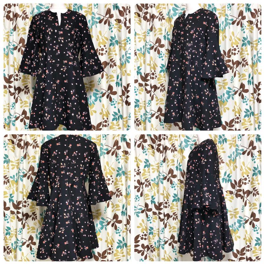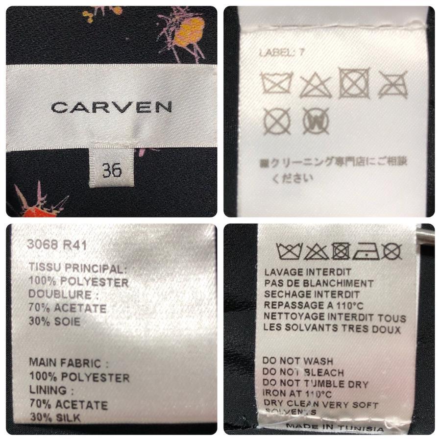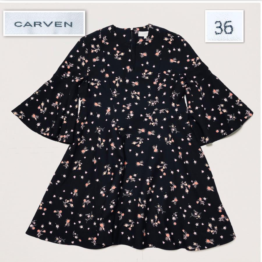 ■商品概要 ランクBCARVEN カルヴェン花柄フレアワンピース七分袖袖切り替えフラワー総柄ブラックsize36(S)チュニジア製表地ポリエステル裏地シルク混アセテートレディース