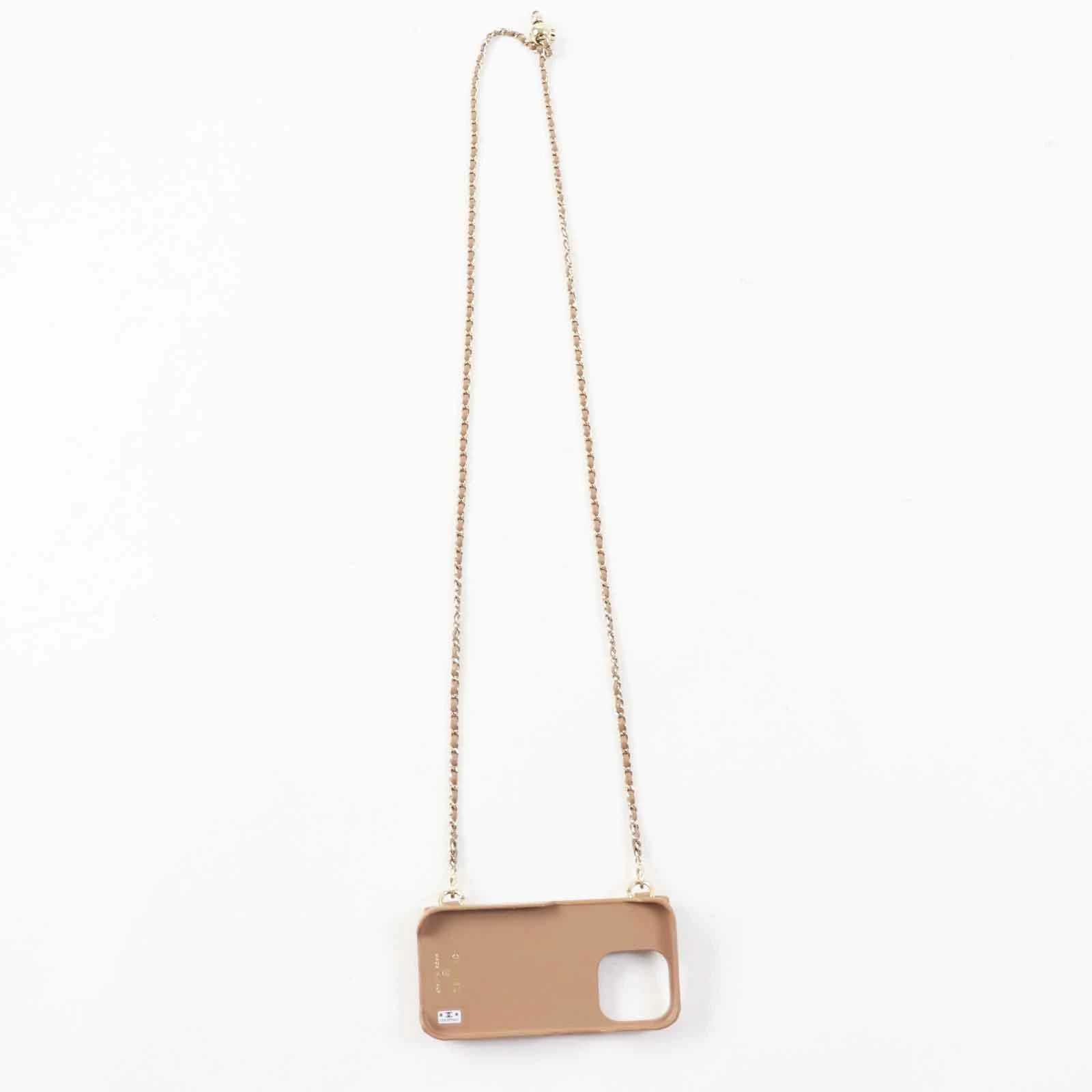 Excellent condition CHANEL AP3553 iPhone 14 Pro caviar skin case with Coco Mark and chain shoulder strap. Brownish beige with gold hardware and box. Made in Italy. Pre-owned.