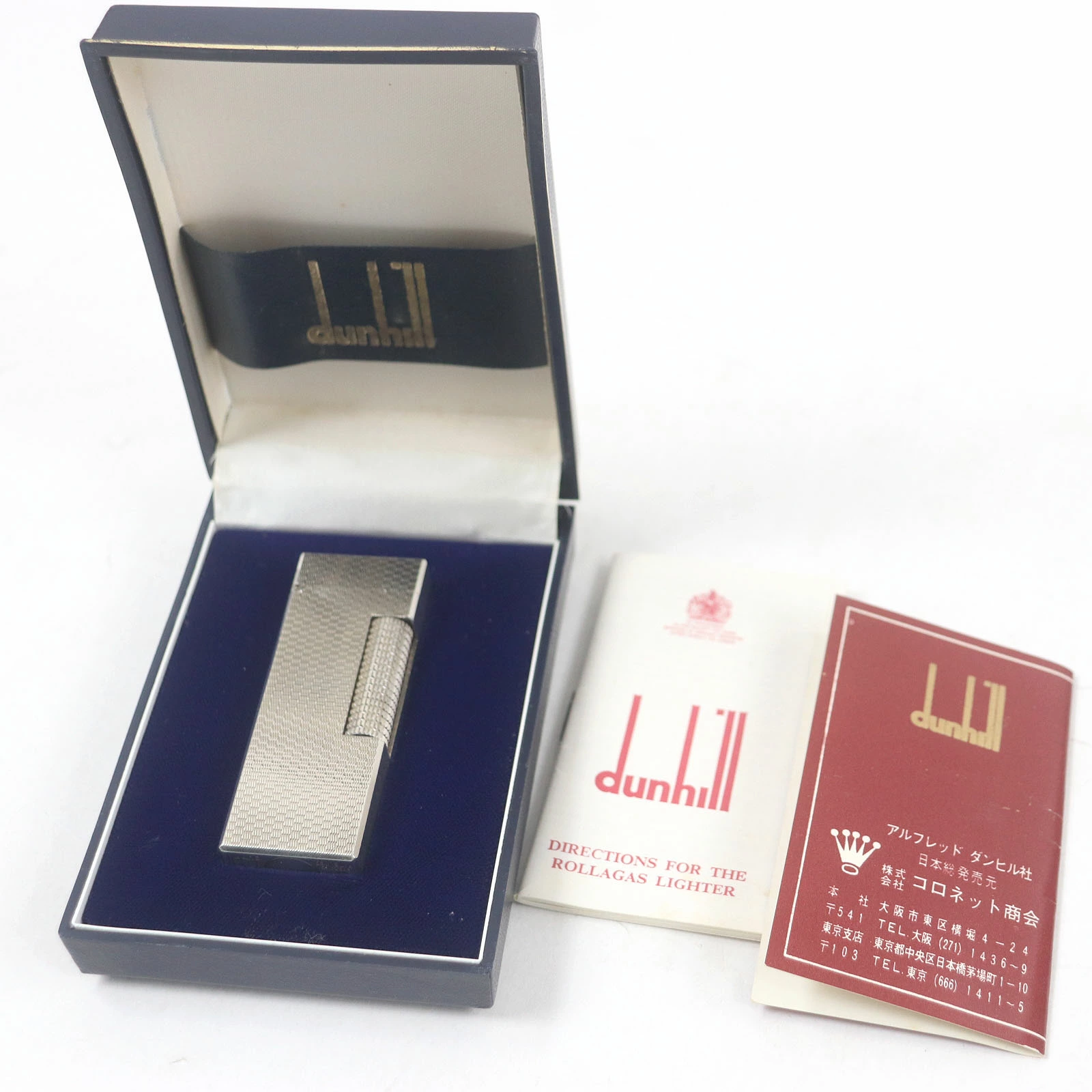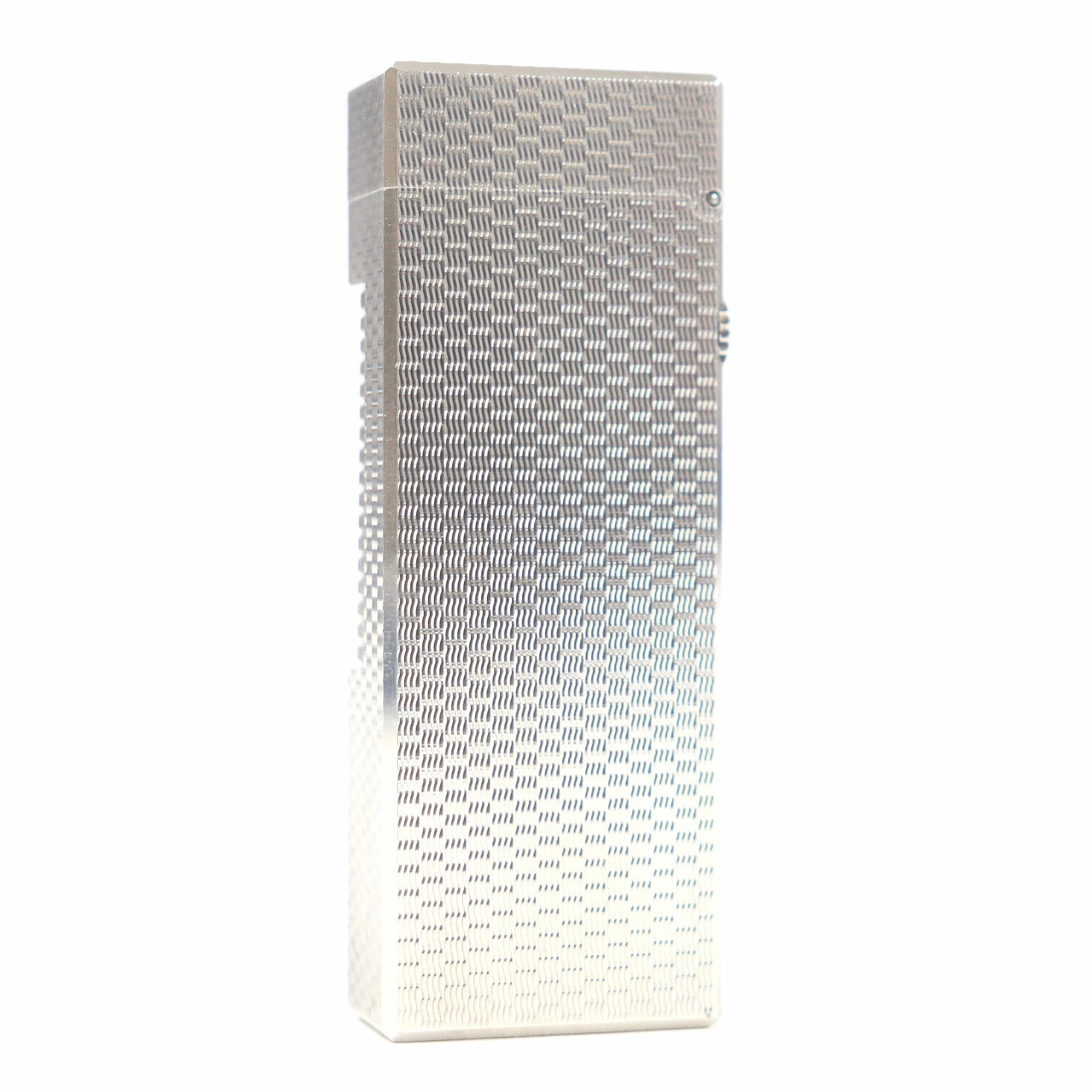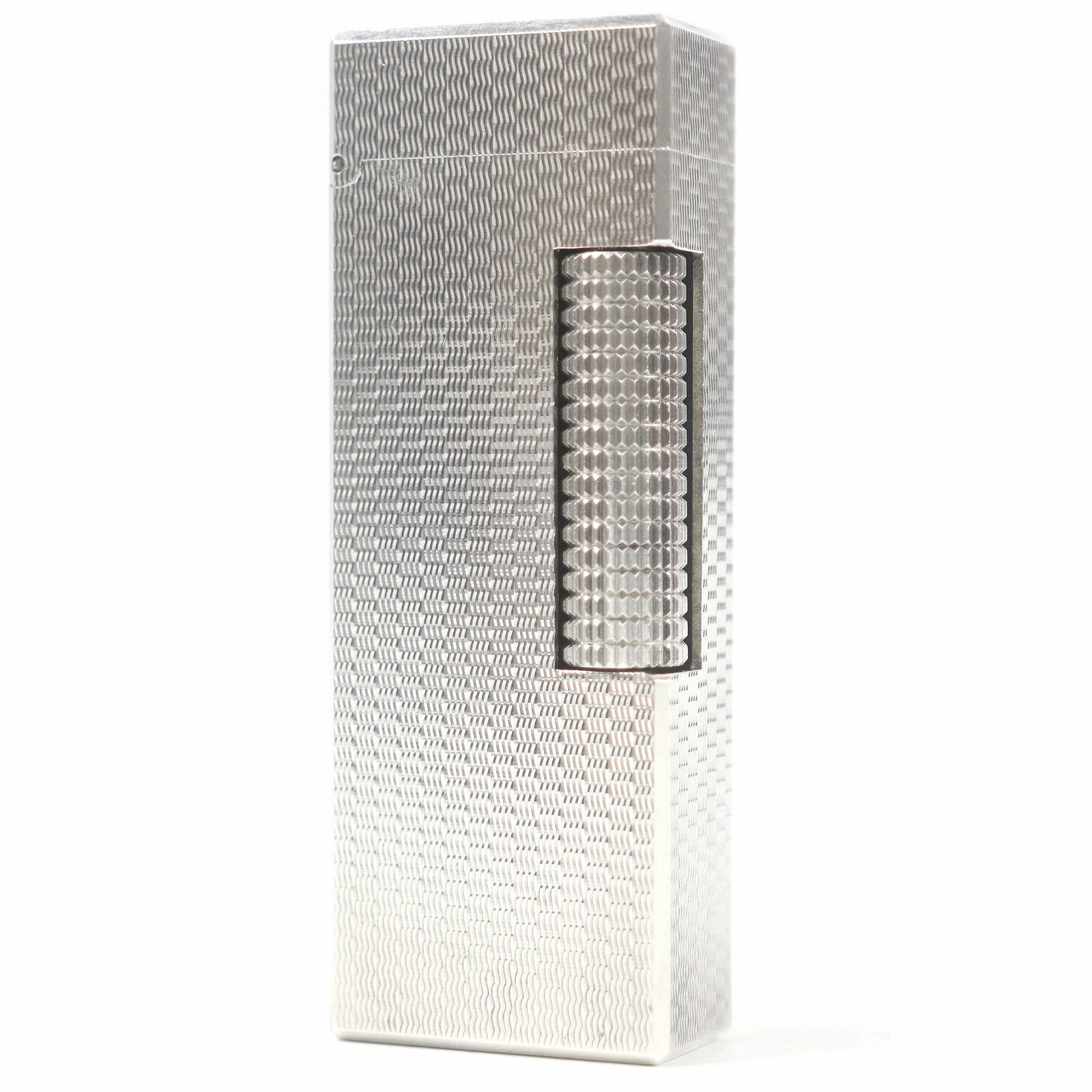 Excellent condition exterior. Dunhill all-over print square roller-style smoking accessory gas lighter, silver, with case. Swiss-made, recommended for men. Unable to light. [Pre-owned]