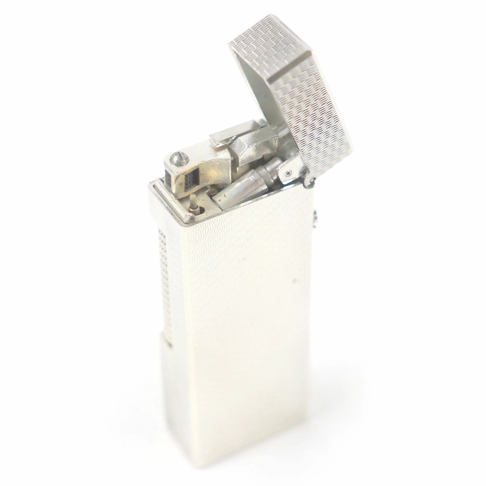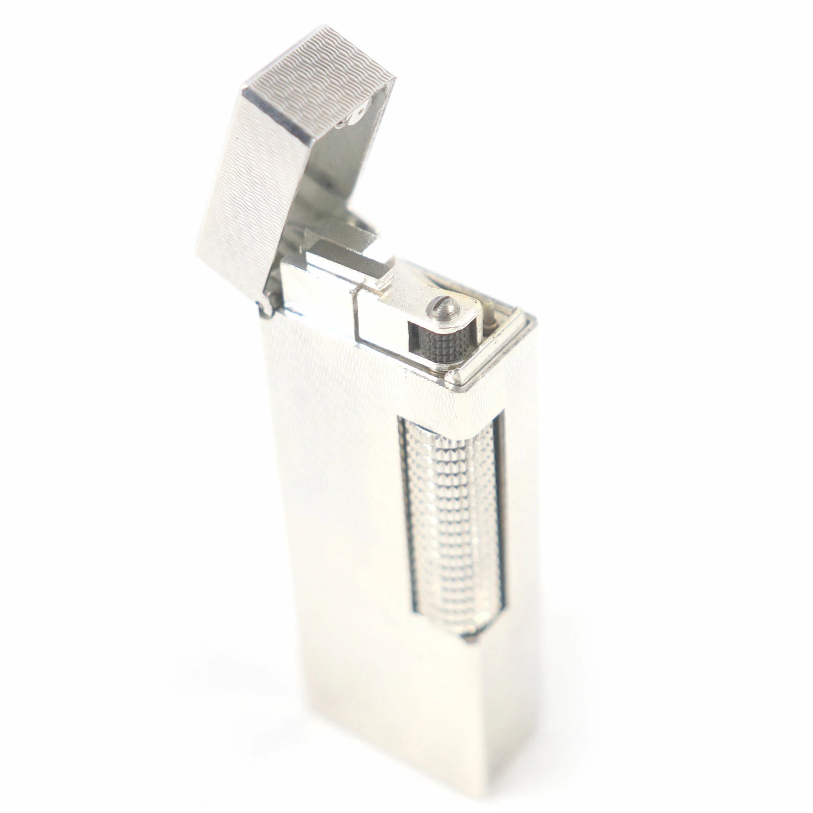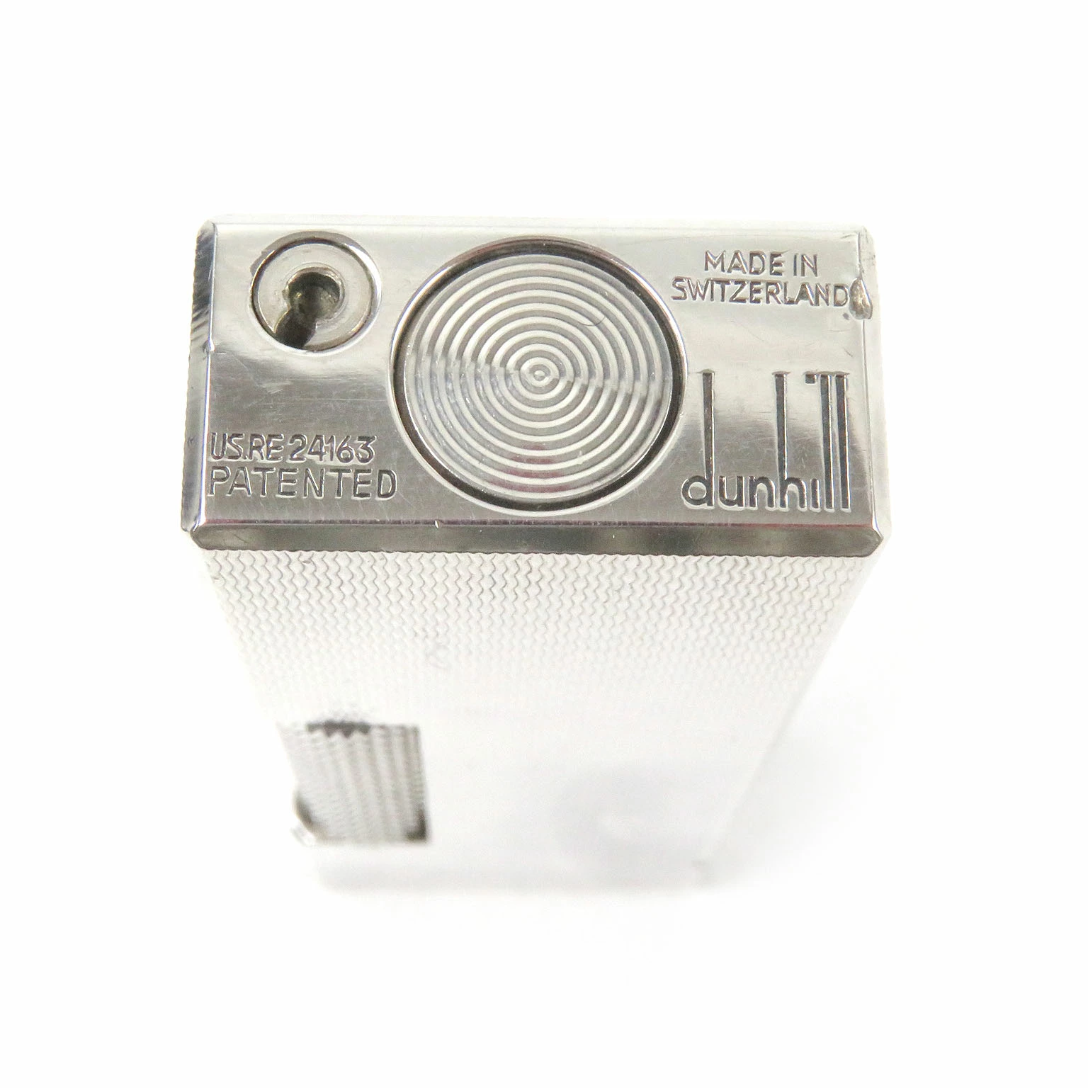Excellent condition exterior. Dunhill all-over print square roller-style smoking accessory gas lighter, silver, with case. Swiss-made, recommended for men. Unable to light. [Pre-owned]