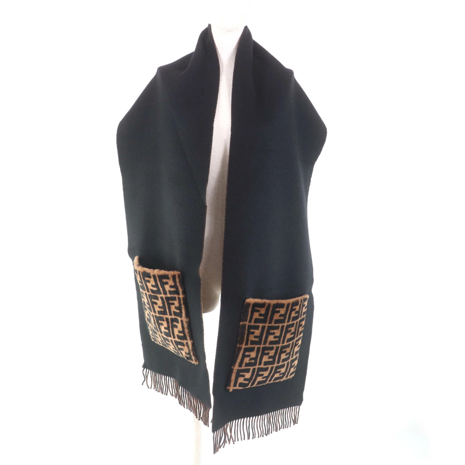 Excellent condition FENDI FXT252 cashmere blend Zucca pattern scarf with fur pocket and fringe. Black/brown. Comes with dust bag. Made in Italy. Women's. [Pre-owned]