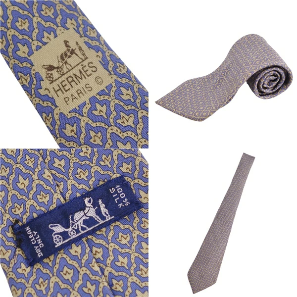 エルメス HERMES ネクタイ 総柄 シルク メンズ フランス製 ネイビー/カーキ サイズ-