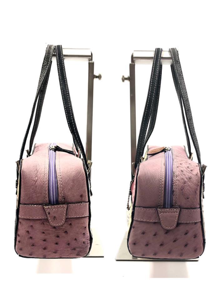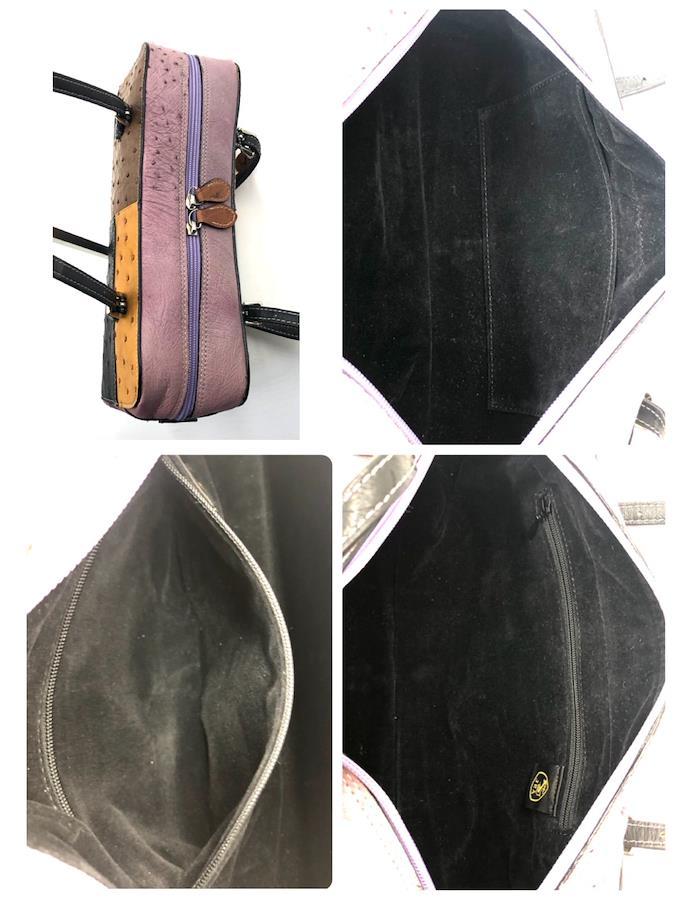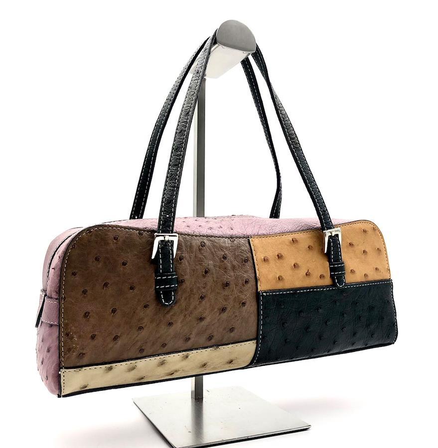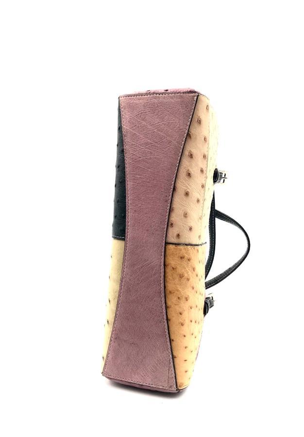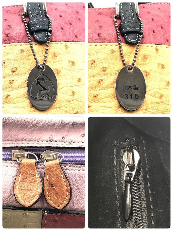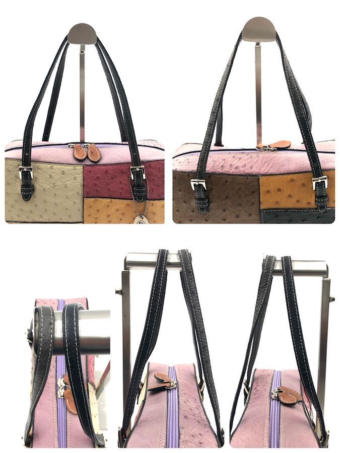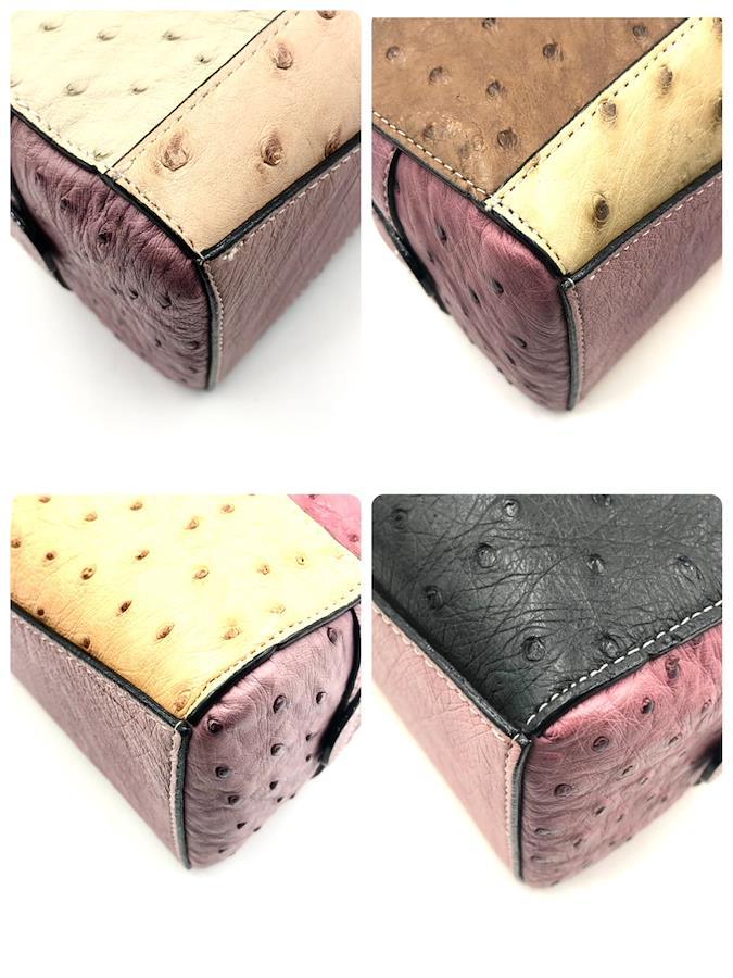 ■商品概要オーストリッチレザーパッチワークデザインミニボストンバッグJRAタグ、織りネーム、しおり本革 ダチョウ革 エキゾチックレザーベージュ系×ピンク系×ブラックレディース