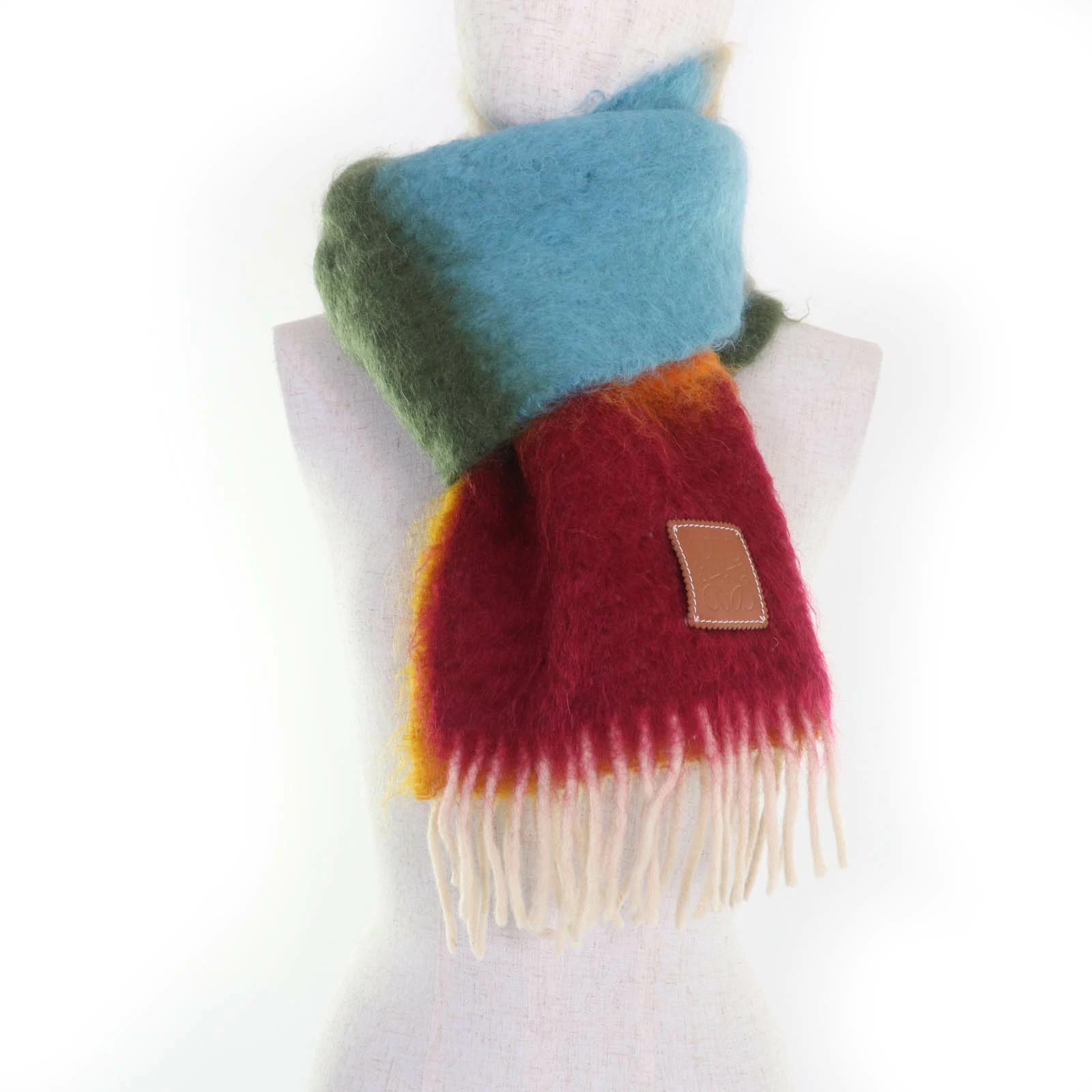 Excellent condition LOEWE mohair wool scarf with Monogram leather patch and fringe, multicolor, made in Spain, authentic, women's [pre-owned]