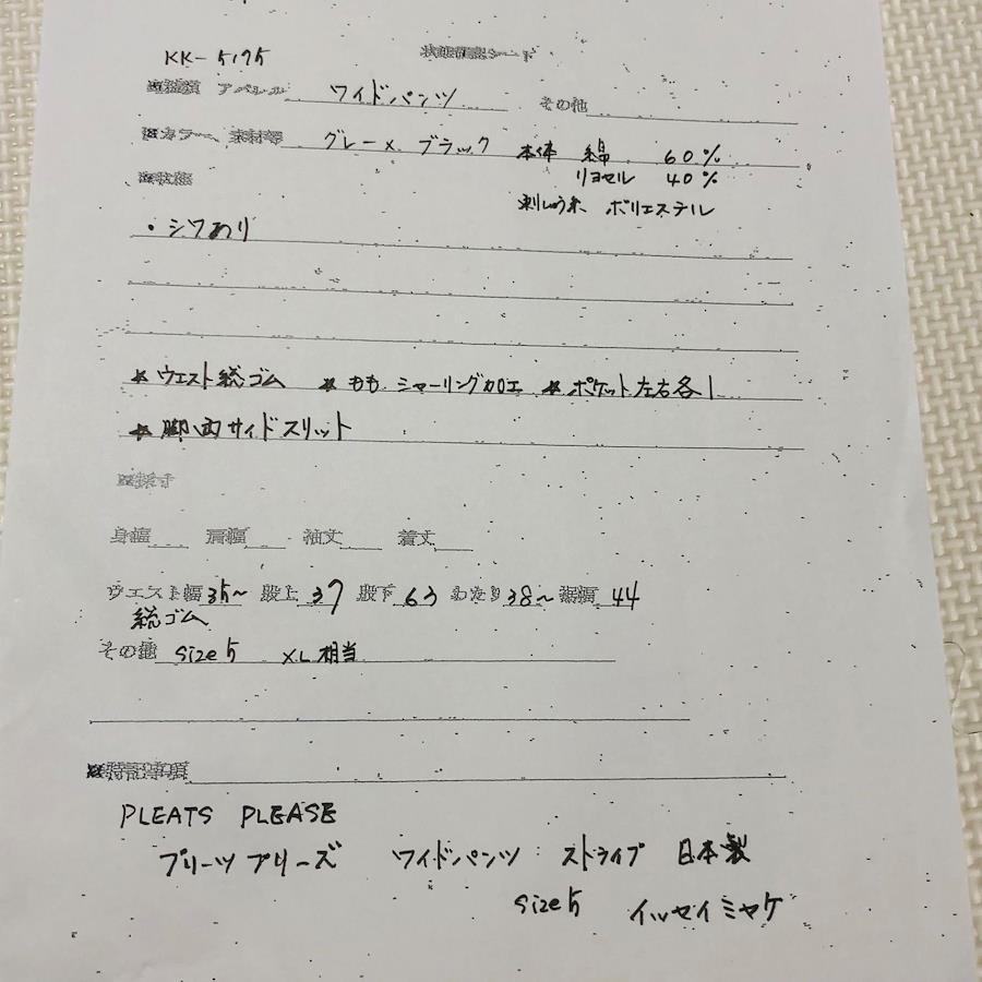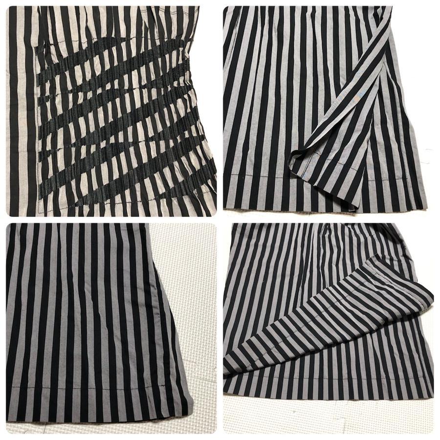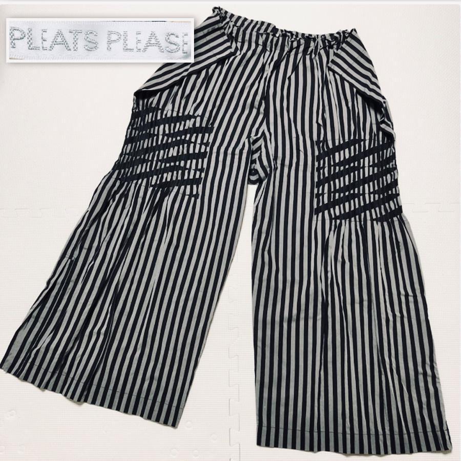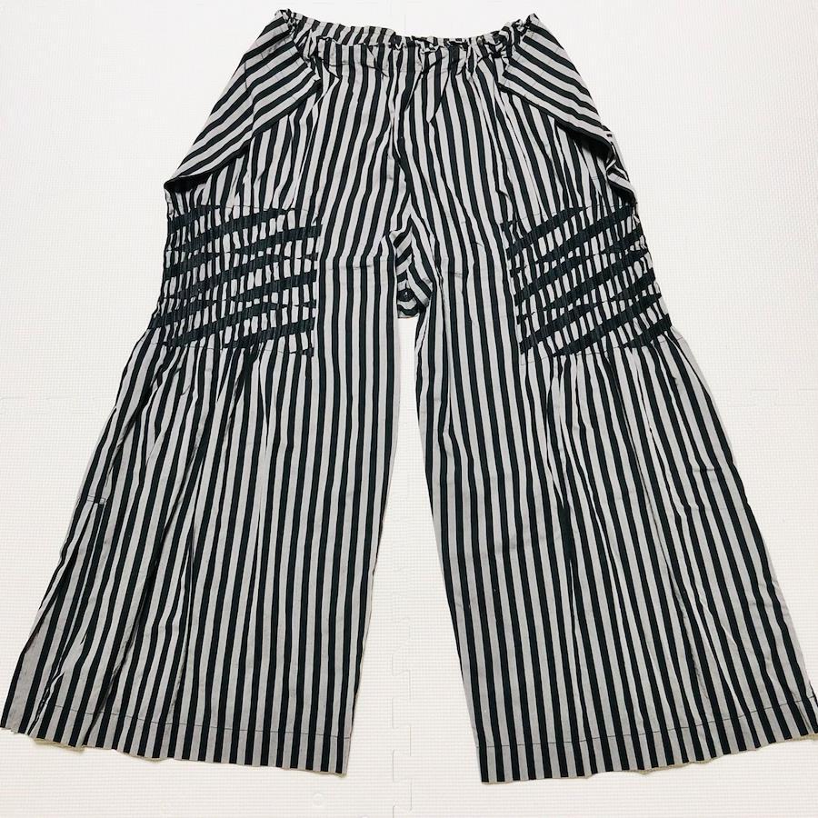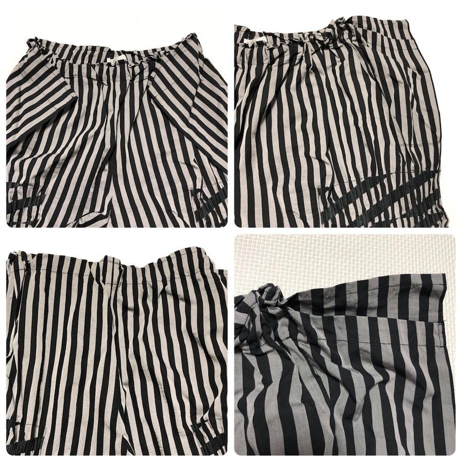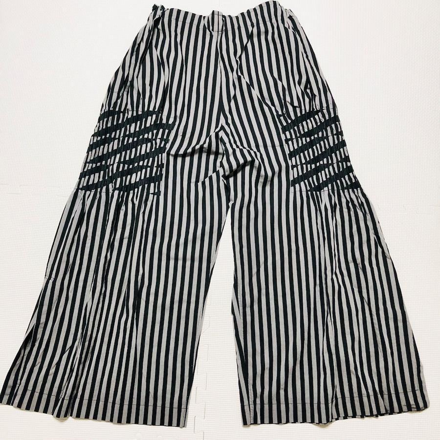 ■商品概要PLEATS PLEASE プリーツプリーズワイドパンツストライプ一部プリーツ加工※写真参照size5(XL相当) ※詳細は下部寸法値を必ずご確認ください日本製イッセイミヤケウエスト総ゴム ももシャーリング加工 脚両サイドスリット大きい 大きめ ビッグサイズレディースグレー×ブラックラグジュアリー 高級