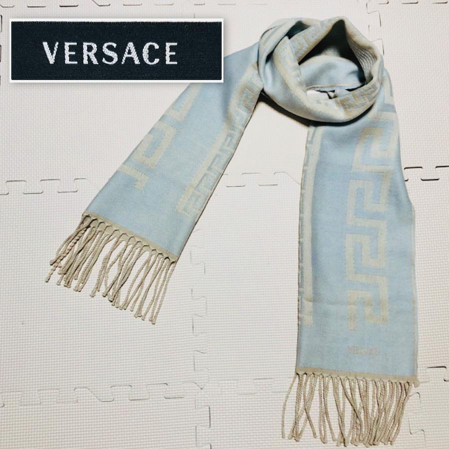 ■商品概要VERSACE ヴェルサーチ ヴェルサーチェウールマフラーギリシア雷文 ロゴイタリア製ミントブルー系×ライトベージュフリンジラグジュアリー 高級 ハイブランドレディース