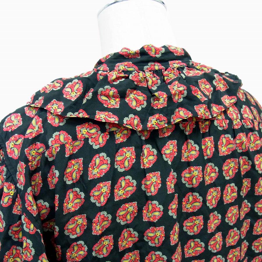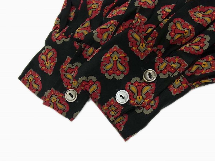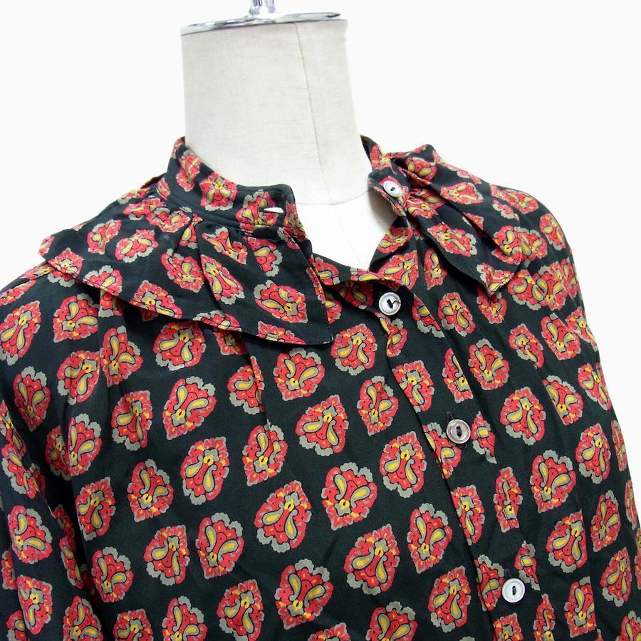 ●明るめのカラーが配色された総柄、手触り最高のシルク100%素材の風合い、襟元はフレアでキュートな小顔を演出してくれます。