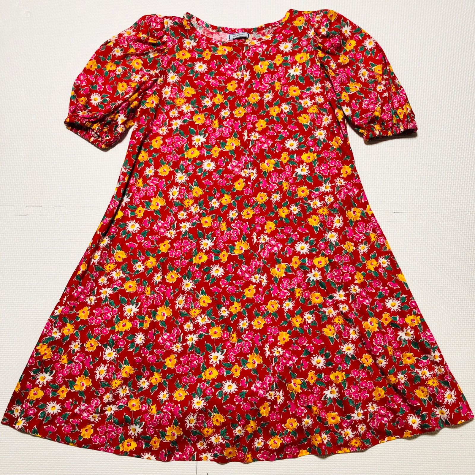 Excellent condition Yves Saint Laurent dress, A-line, puff sleeves, floral print, knee-length, size M, made by Fukusuke, 100% cotton, shoulder pads, red and multicolor, women's