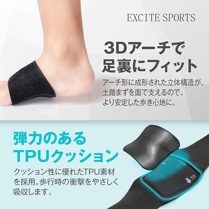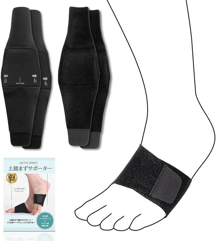 「セット内容」土踏まずサポーター(左右両用・4枚セット)、説明書「製品仕様」[適応サイズ] 足の甲周り18~28cm [製品サイズ] 約横31cmx幅9cmx厚み1.5mm(クッション部分厚み2.0mm)[素材] 表面:ナイロン、スパンデックス/裏面&テープ部分:ポリエステル/クッション部分:TPU(熱可塑性ポリウレタン) [重量] 約19g [カラー] ブラック