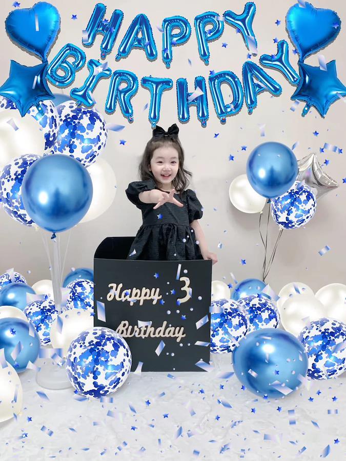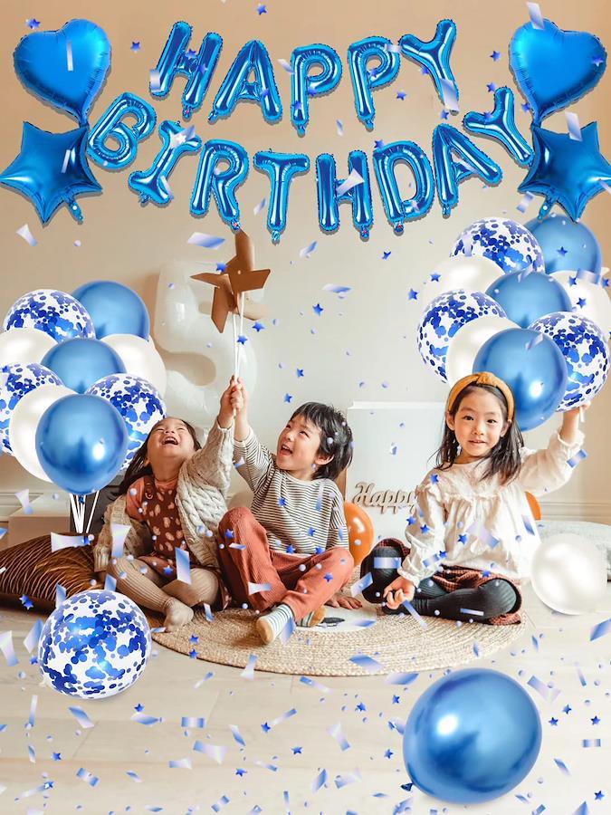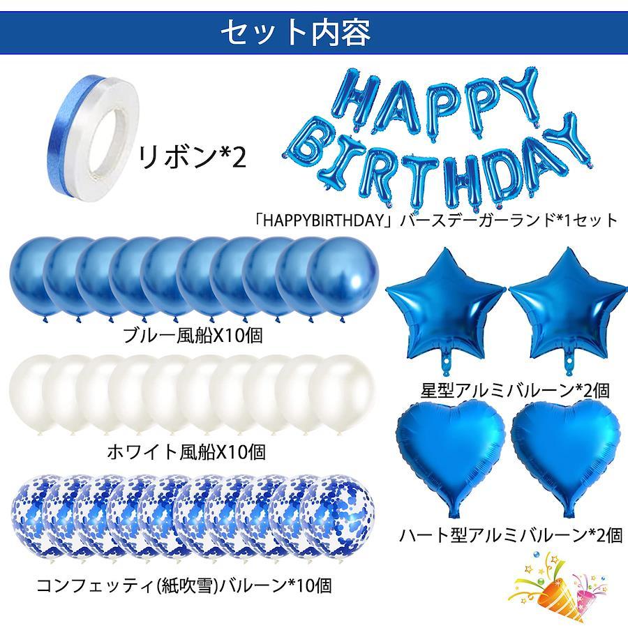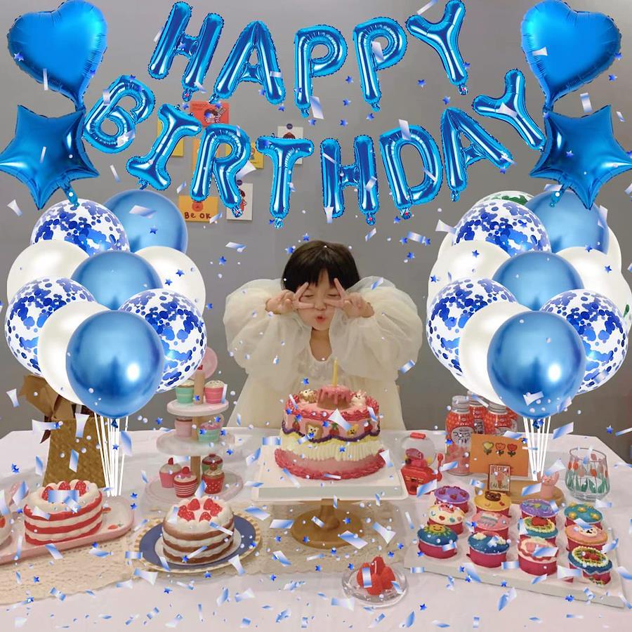 【ハッピーバースデー】楽しいパーティーに風船が足りないなんて。風船のあるパーティーは、もっと楽しいです。ハッピーバースデーバルーンセットは、お誕生日のお祝いイベントを活気に溢れさせ、友達と家族の誕生日をサプライズします。最も美しい気球で、最も誠実な愛で部屋を満たして、あなたの最愛の人に忘れられない驚きを与えます。【セット内容】①HAPPY BIRTHDAYバースデーガーランド*1 ②星型アルミバルーン*2個③ハート型アルミバルーン*2個④ブルー風船X10個(約25cm)ホワイト風船X10個(約25cm) ⑤コンフェッティ(紙吹雪)バルーン*10個(約25cm)⑥リボン*2。注意:この商品には空気入れと両面テープがありません。必要であれば、別途に購入してください。【作り方】カールリボンのご使用方法:リボンは、壁や窓にHappy Birthdayアルファベットを掛けるために使用されます。HAPPY BIRTHDAYの15文字風船の上に紐を通す穴があります、付属のリボンを通すだけで素敵なガーランドが作れます。両面テープは剥がしやすく、壁に傷めつけにくいので、便利で、キレイです。【製品の用途】誕生日パーティー、結婚式、記念日、クリスマスなどのお祝いの日に装飾をして使います。また、誕生日のバルーンセットの装飾は忘れられない思い出と面白い記念写真を撮ってくれます。人生で一番いい思い出になります。【注意事項&安心保障】アルファベットバルーン、スターバル―ン、ラブバルーンはアルミフィルム製で弾力性がありません。風船に空気を入れる際は、破れないように少しずつ空気を入れてください、アルミ風船は空気を入れすぎると破裂してしまうこともありますのでご注意ください。【免責事項】メーカーによる商品リニューアルに伴いパッケージ(内容量も含む)変更が行われた場合、新パッケージでお届け致します事ご了承願います。