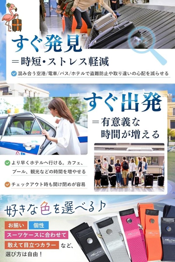 2、「すぐに発見できる」 ・ベルトが無い場合と比べるとその差は歴然 ・荷物受取などで速やかにかつ間違えずに自分の荷物を取り出すことができます ・ホテルなどの移動先に素早く移動が出来たり、盗難防止に繋がります