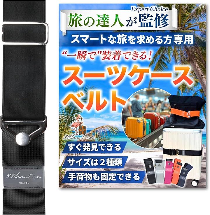 1、「専門家が監修」 ・スマートな旅を求める方に使って欲しい「一瞬で装着できるスーツケースベルト」 ・ベルトを伸ばしてフックを掛ければ装着完了 ・旅先の貴重な時間をより有意義に