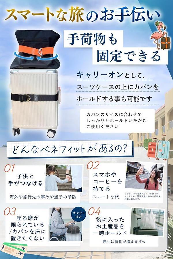 3、「手荷物も固定できます」 ・手荷物も固定できる2Way仕様です ・カバンをおいてベルトをかけるだけで片手が空くスマートな仕様 ・旅先で増えたお土産などもかけることができるので素敵な相棒になってくれます
