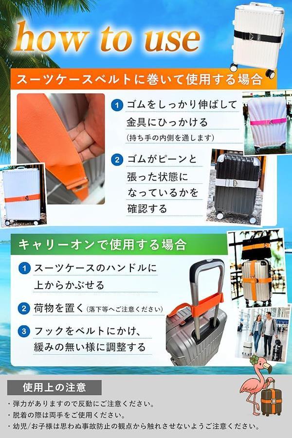 2、「すぐに発見できる」 ・ベルトが無い場合と比べるとその差は歴然 ・荷物受取などで速やかにかつ間違えずに自分の荷物を取り出すことができます ・ホテルなどの移動先に素早く移動が出来たり、盗難防止に繋がります