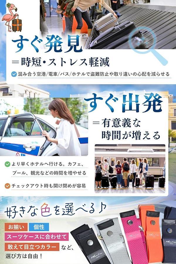 2、「すぐに発見できる」 ・ベルトが無い場合と比べるとその差は歴然 ・荷物受取などで速やかにかつ間違えずに自分の荷物を取り出すことができます ・ホテルなどの移動先に素早く移動が出来たり、盗難防止に繋がります