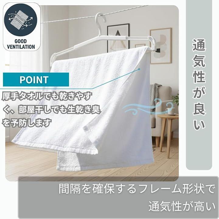 間隔を確保するフレーム形状で通気性も高いので、厚手タオルでも乾きやすく、生乾き臭の発生要因を抑える干し方を後押し。