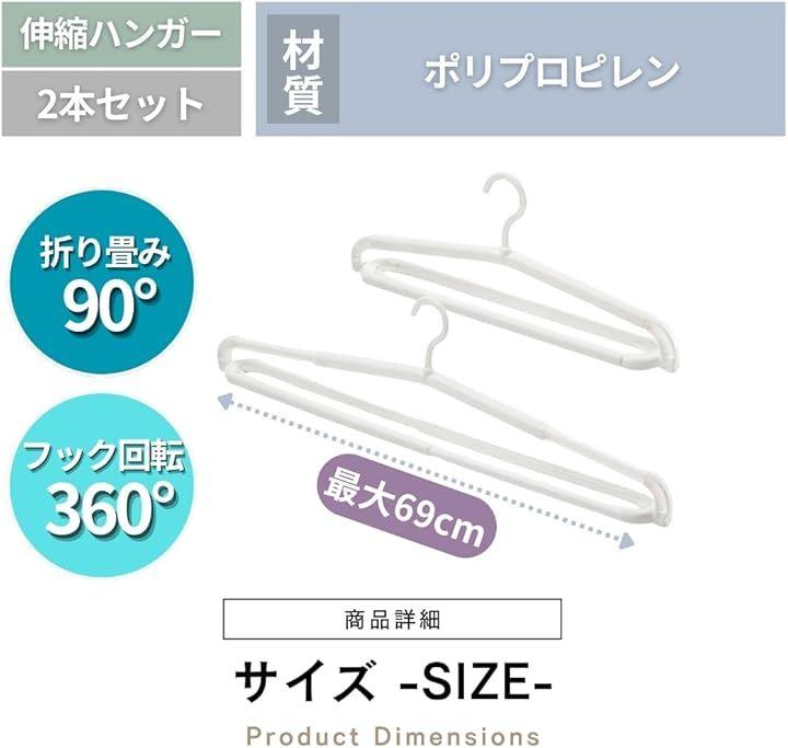 「商品内容」パッケージ内容:伸縮ハンガーx2本 伸縮幅(約):69cmまで 主な材質:ポリプロピレン *サイズ詳細は商品画像をご確認ください。