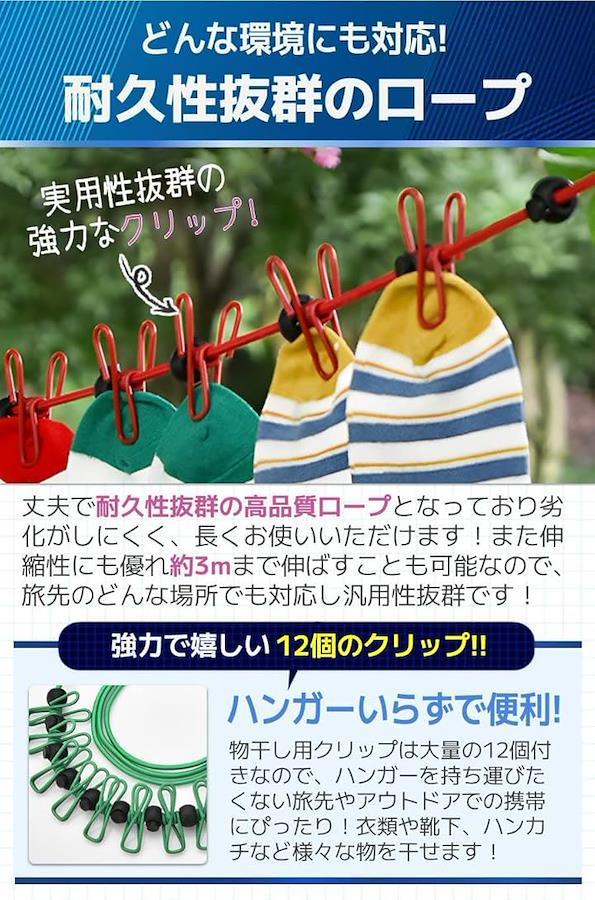 「ハンガーいらずで便利.」物干し用クリップは大量の12個付きなので、ハンガーを持ち運びたくない旅先やアウトドアでの携帯にぴったり。衣類や靴下、ハンカチなど様々な物を干せます。